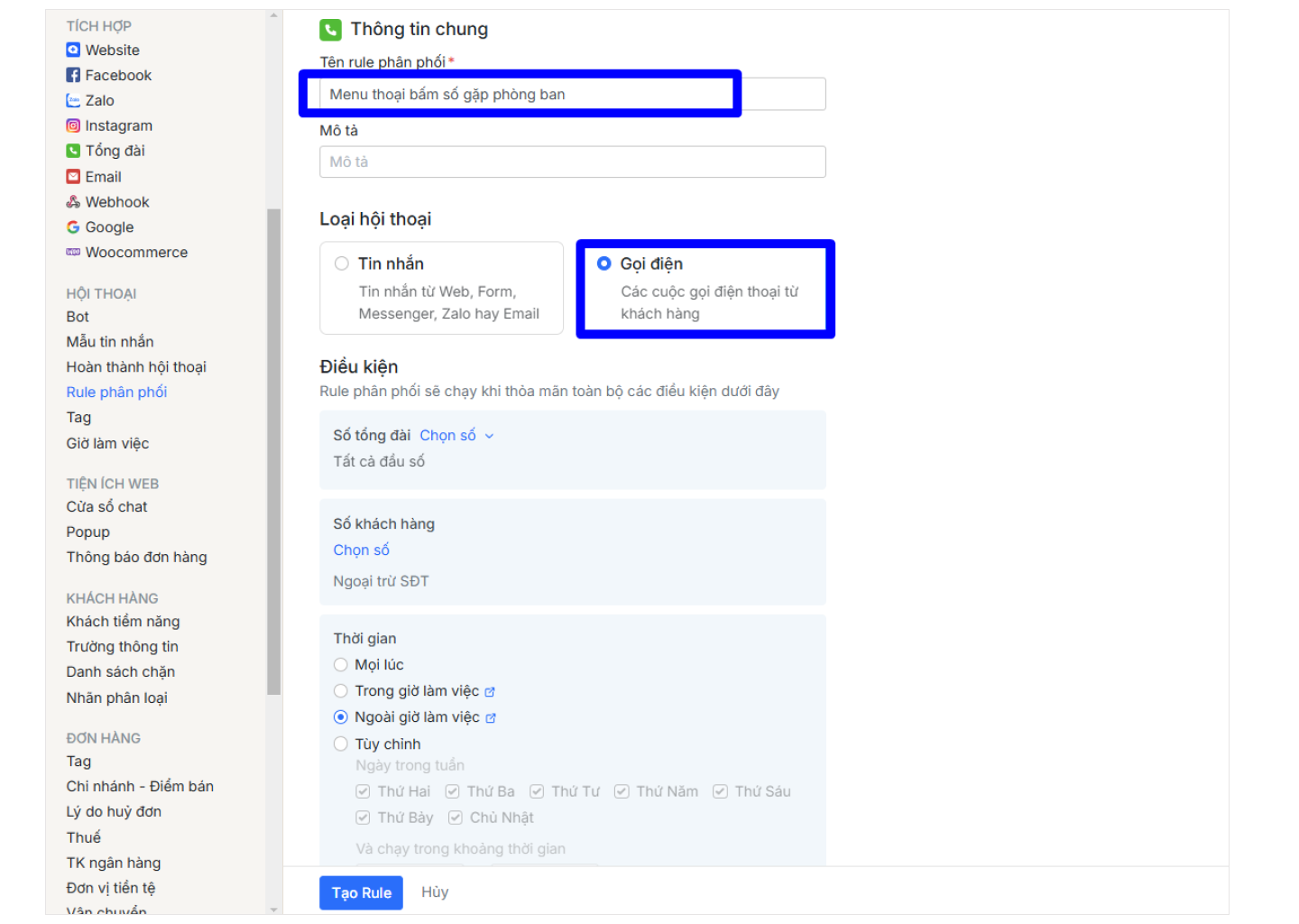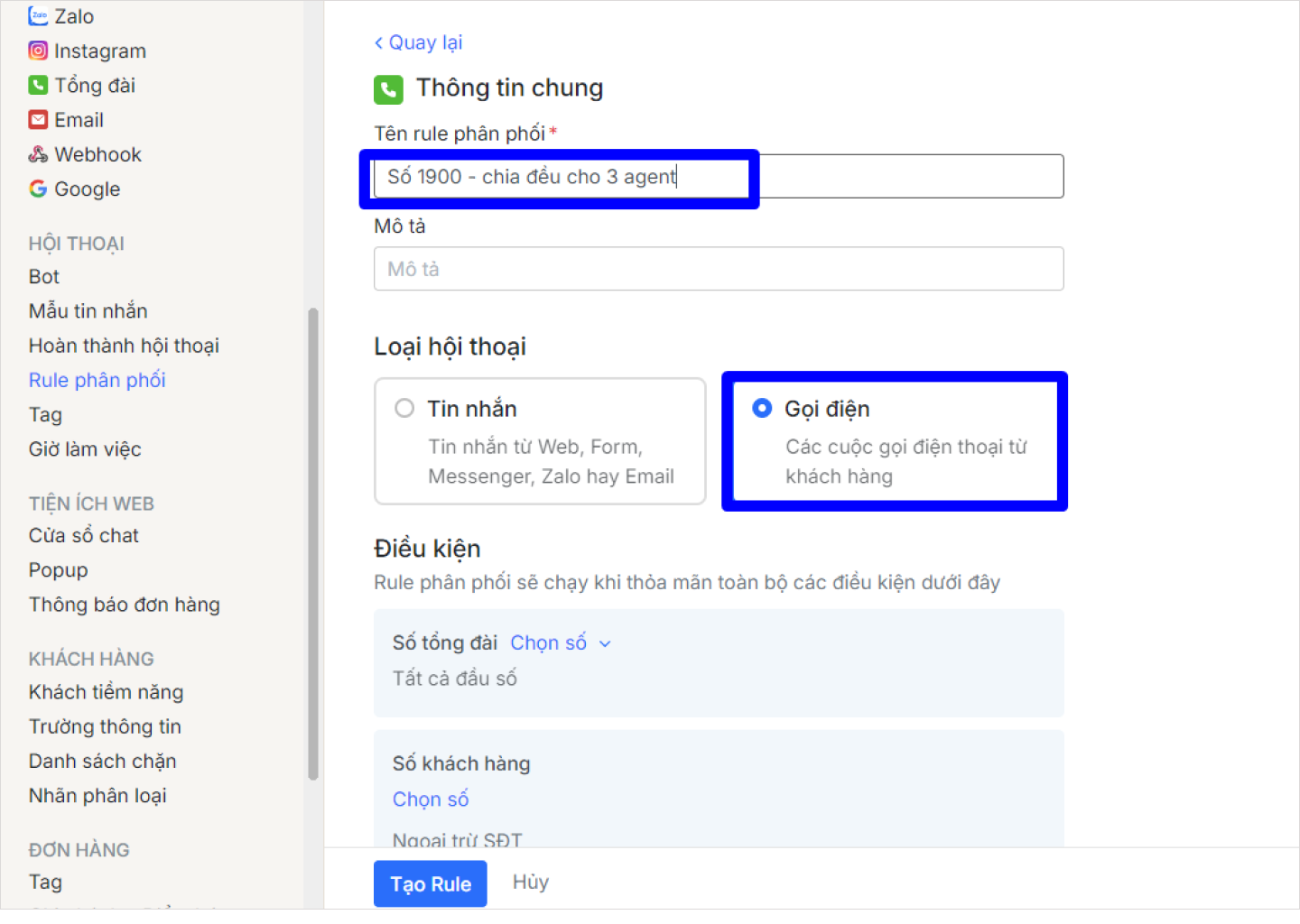 Mỗi quy tắc chia cuộc gọi của bạn sẽ tương ứng với một rule phân phối. Bạn có thể tạo nhiều rule, và các cuộc gọi sẽ được xử lý lần lượt theo thứ tự các rule đã cài đặt.