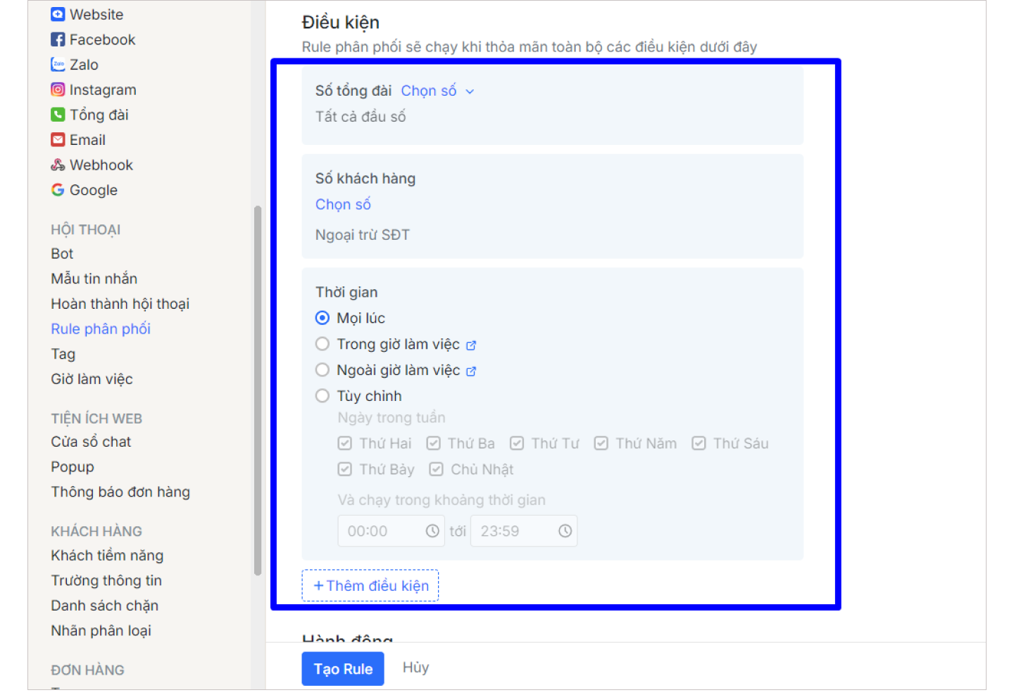 - Điều kiện: Chọn thời gian là trong giờ làm việc. Tùy chỉnh giờ làm việc tại đây.