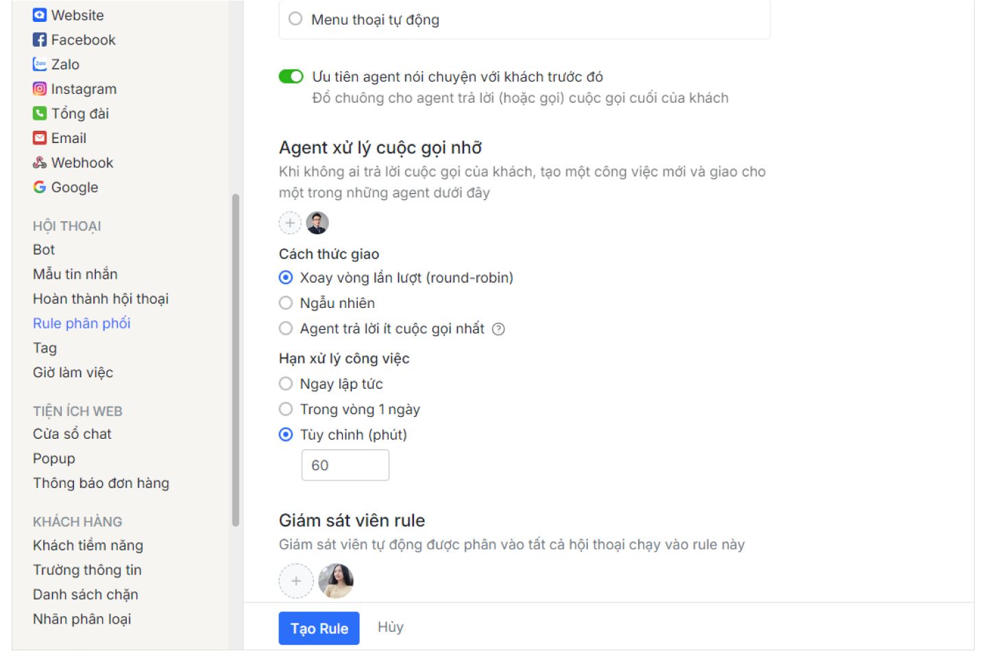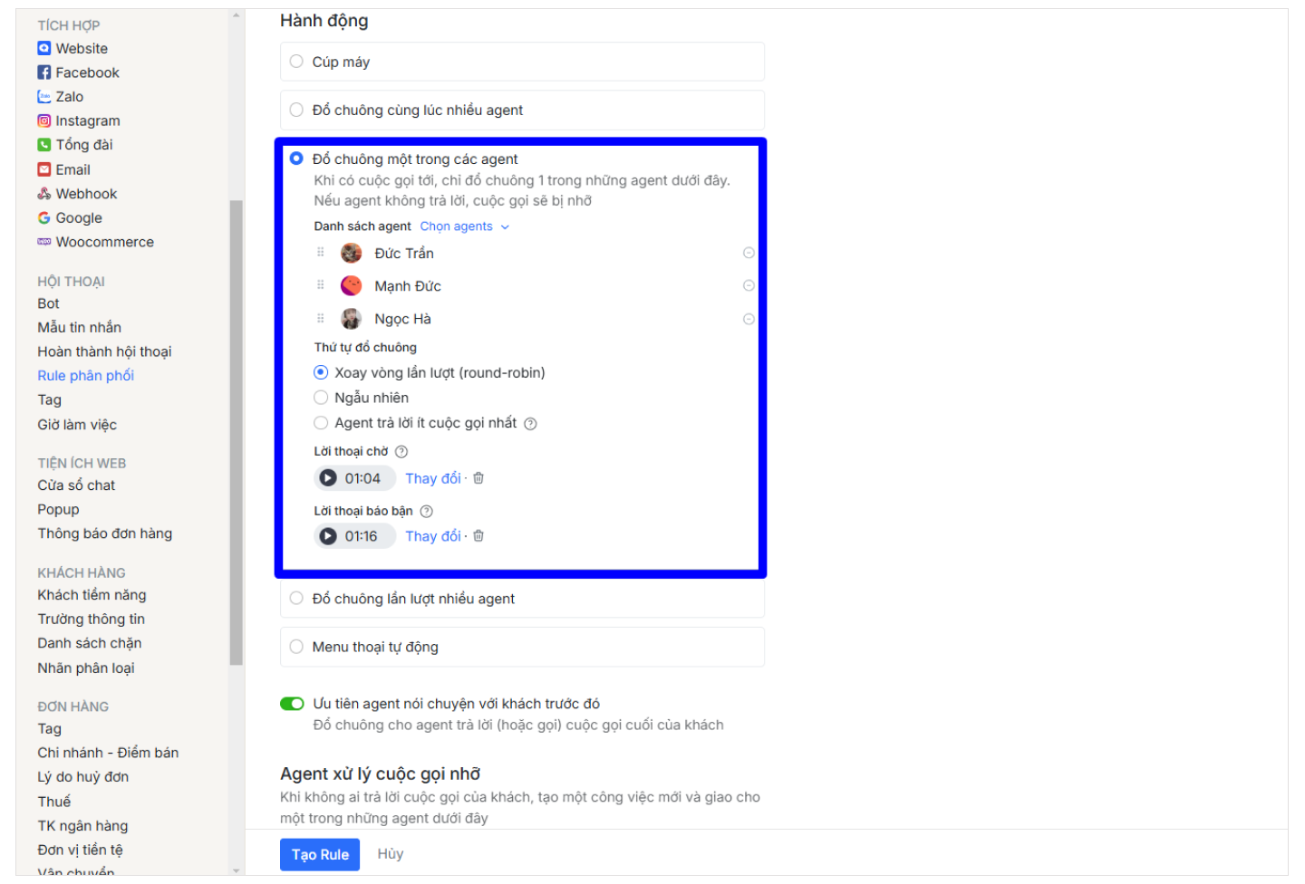 - Thêm agent xử lý cuộc gọi nhỡ. Lưu ý: Luôn thêm agent phụ trách xử lý cuộc gọi nhỡ để tránh bỏ sót khách hàng.