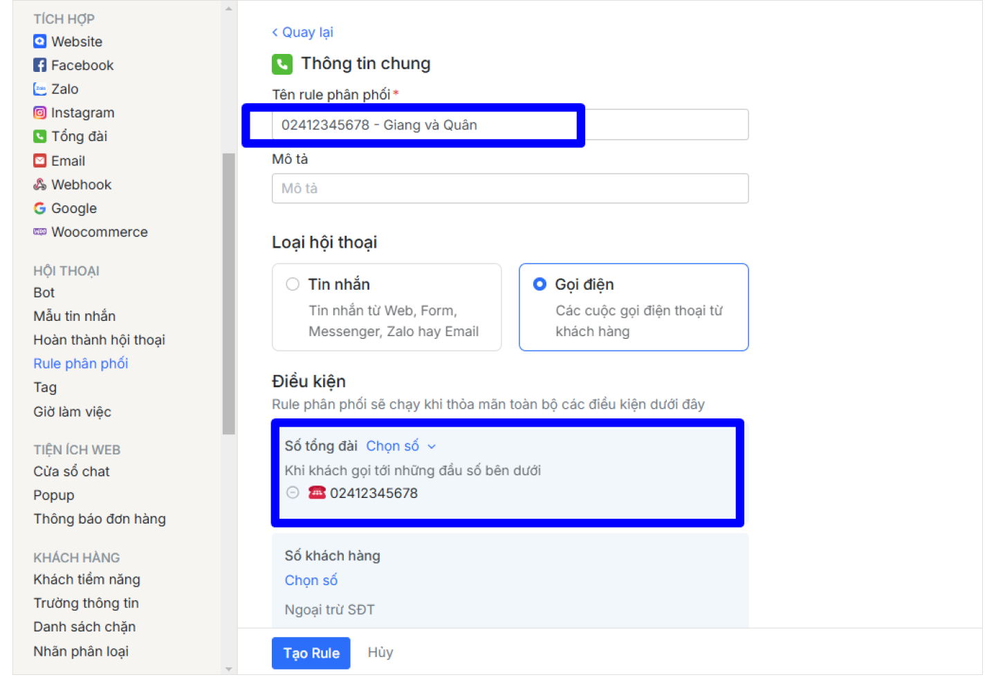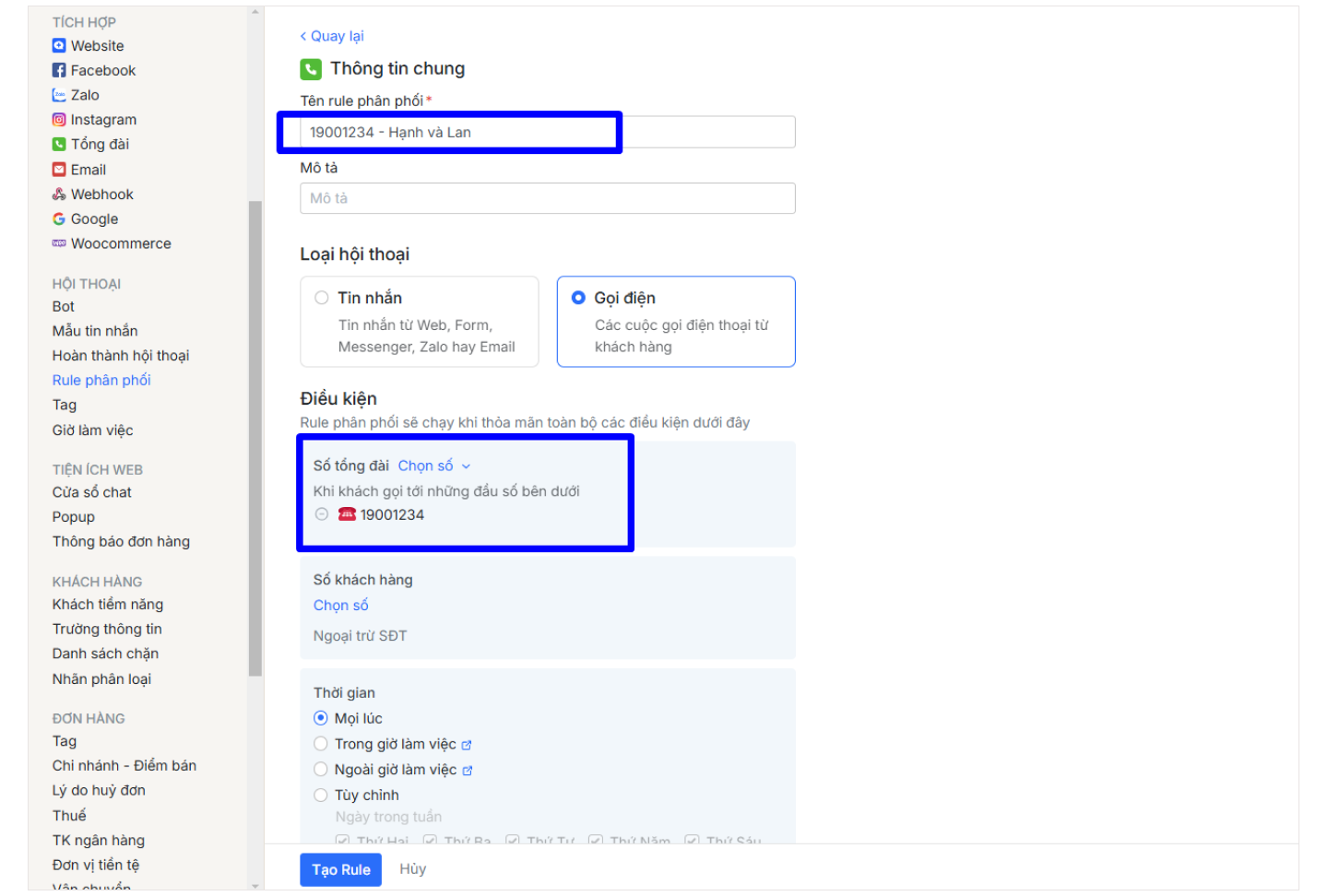 Rule 1: Đặt tên rule là "19001234 - Hạnh và Lan".- Điều kiện: chọn số tổng đài là 19001234.
