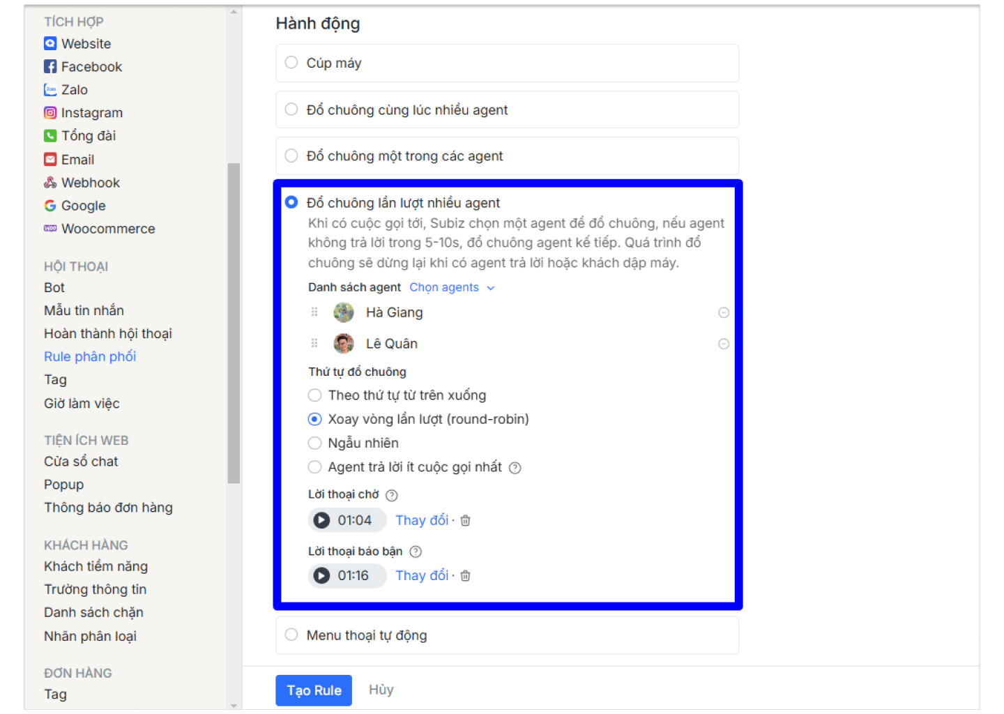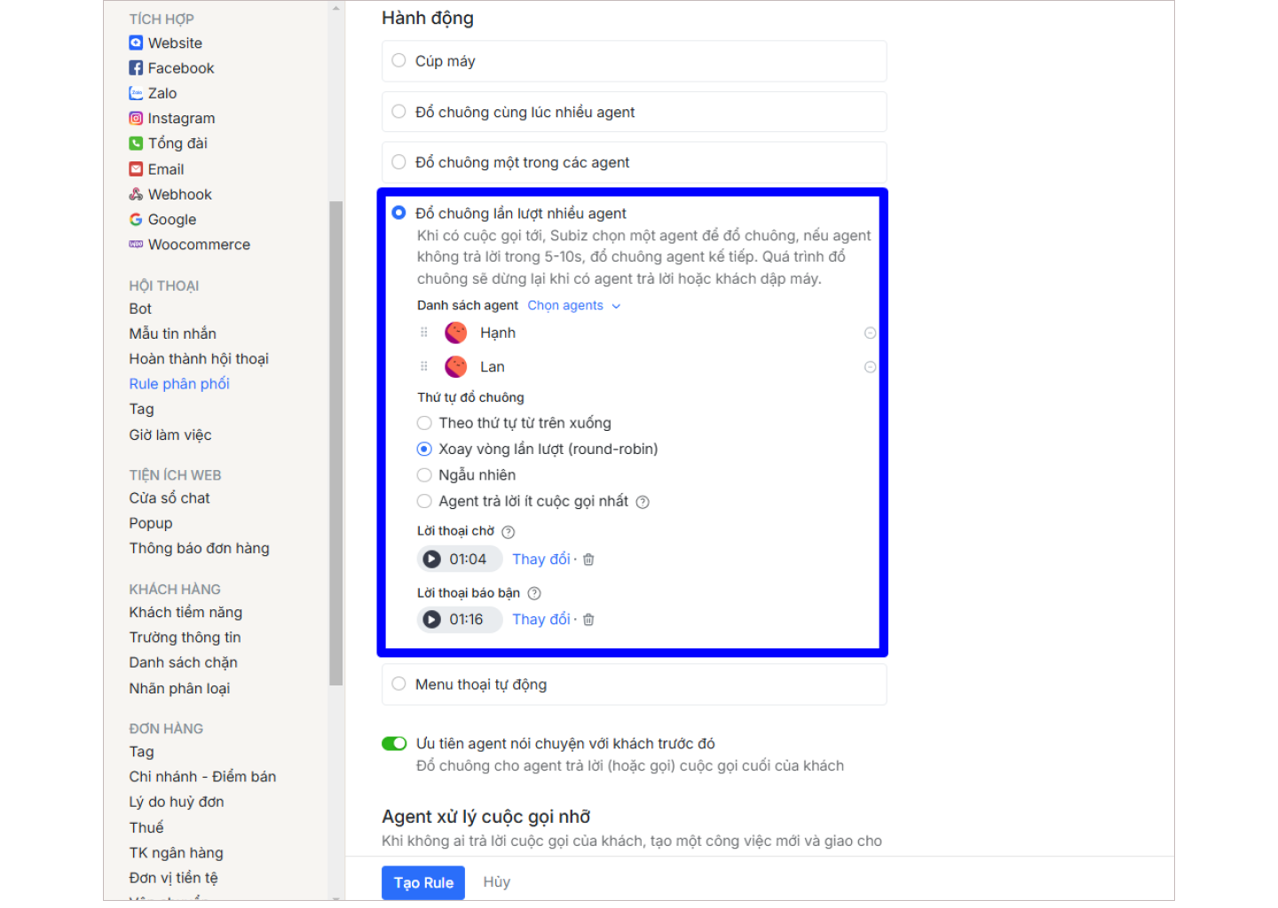 - Hành động: chọn Đổ chuông lần lượt cho agent Hạnh và Lan.