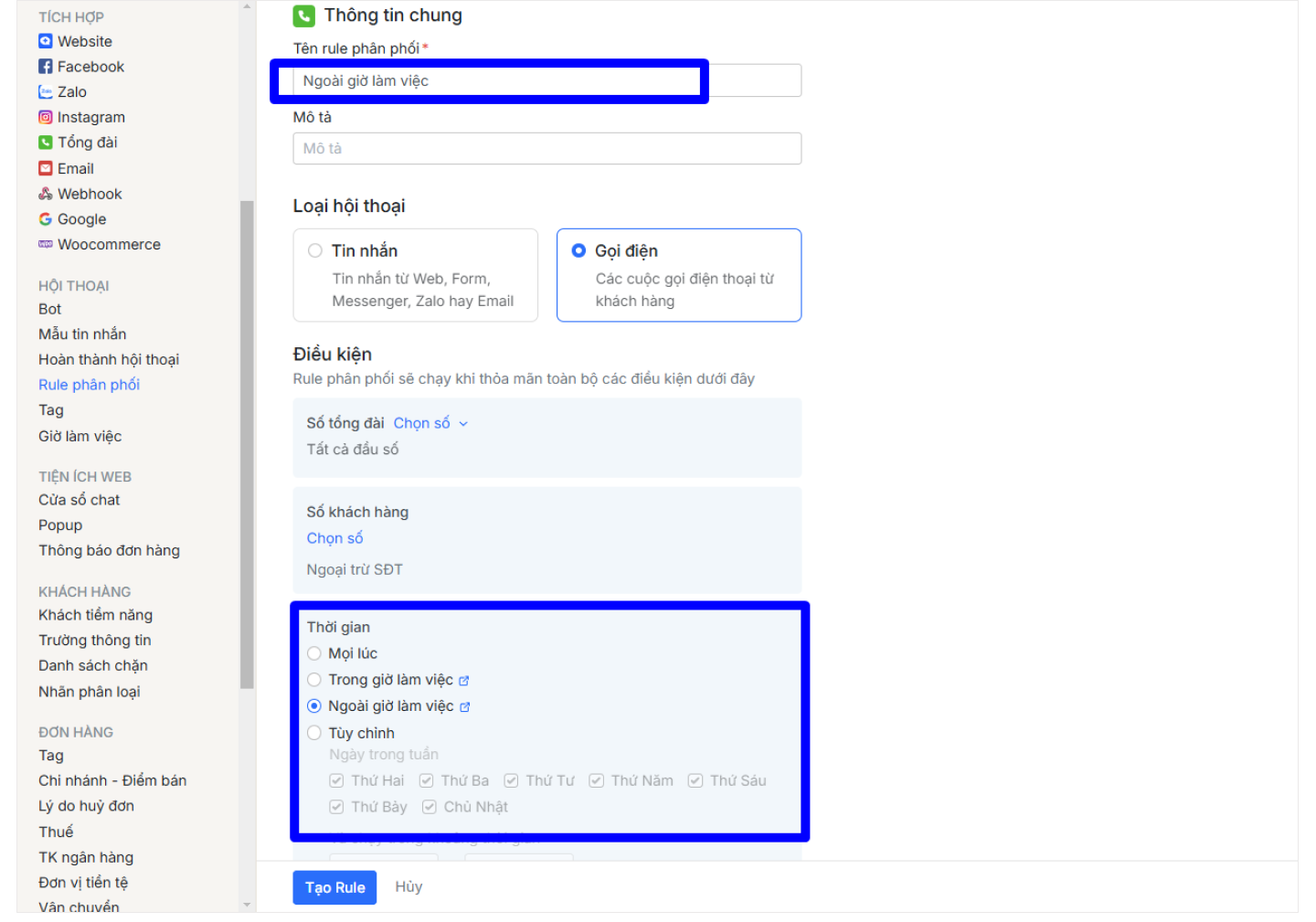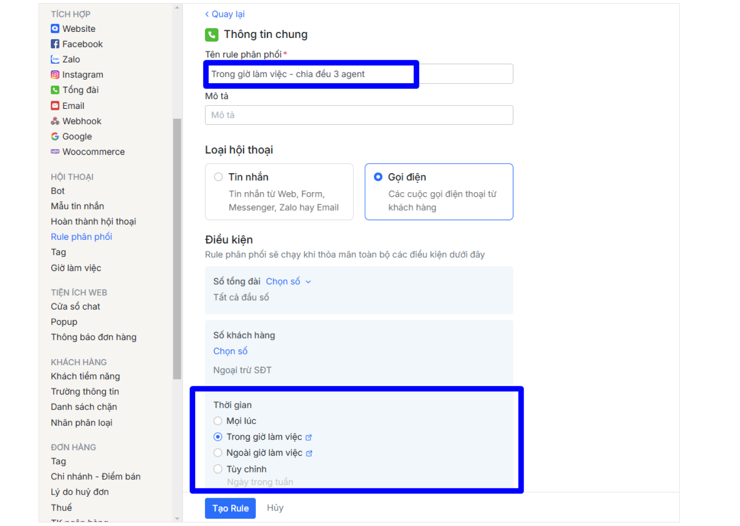 Rule 1: Cuộc gọi trong giờ làm việc được chia đều cho 3 agent.- Đặt tên rule là “Trong giờ làm việc - chia đều 3 agent”