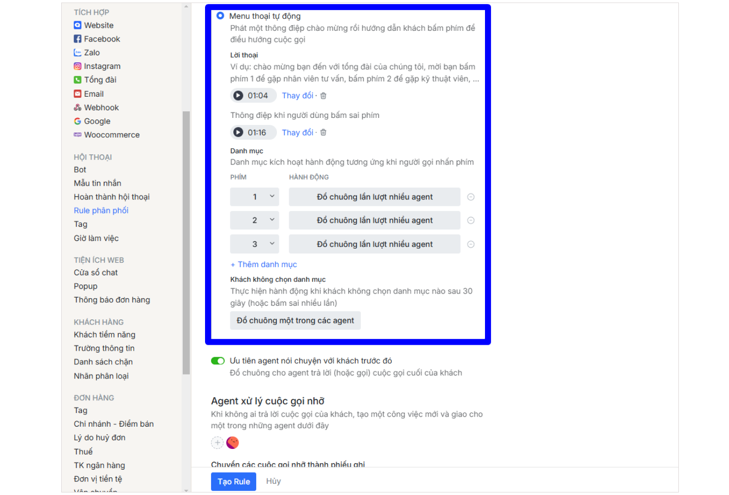 - Hành động: chọn Menu thoại tự động và thêm lời thoại hướng dẫn khách. Với mỗi lựa chọn số, thiết lập hành động đổ chuông đến agent phù hợp.