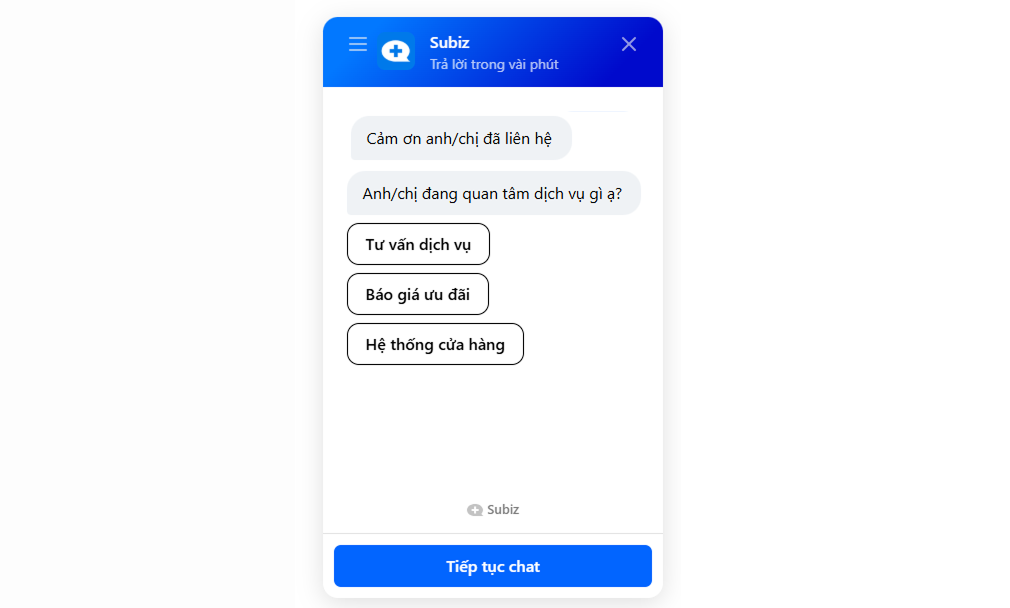 Để xác định phòng ban hỗ trợ khách. Bạn hãy tạo tin nhắn Bot khéo léo hỏi thăm nhu cầu của khách, hiện sẵn các gợi ý mời khách chọn nhanh. Cụ thể: