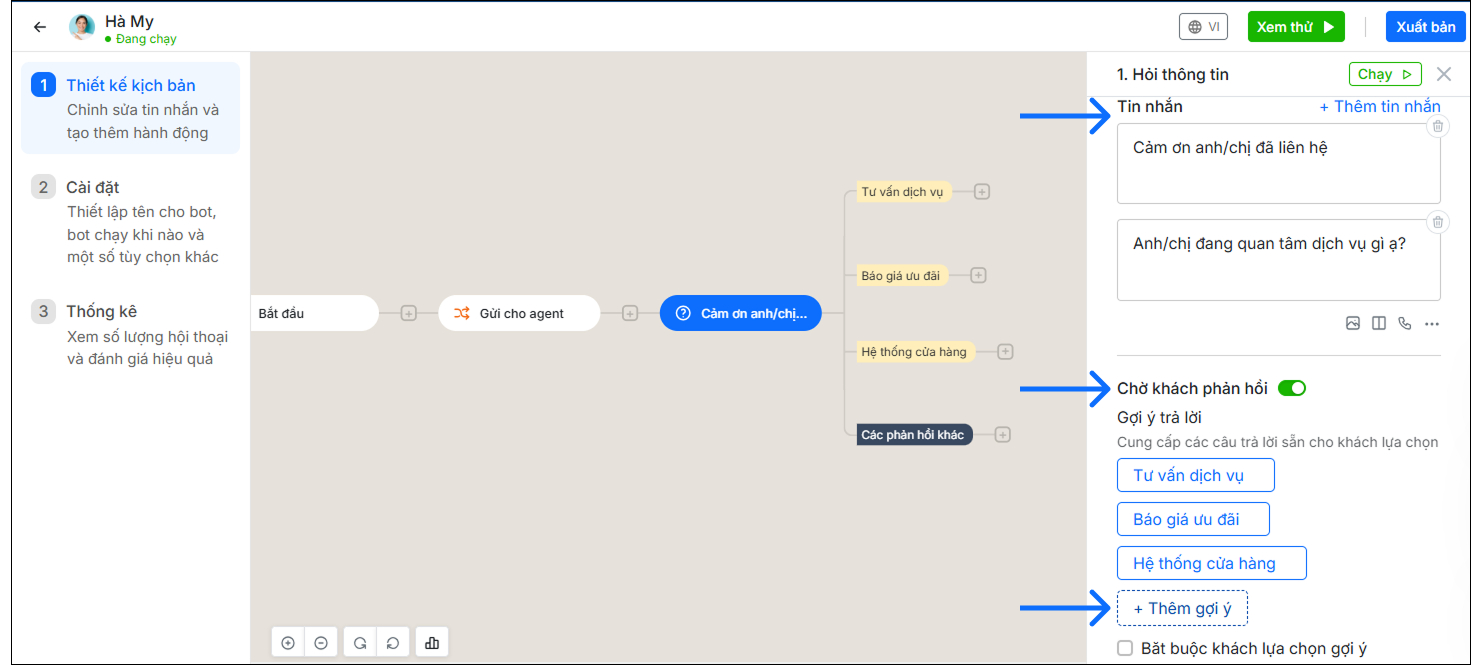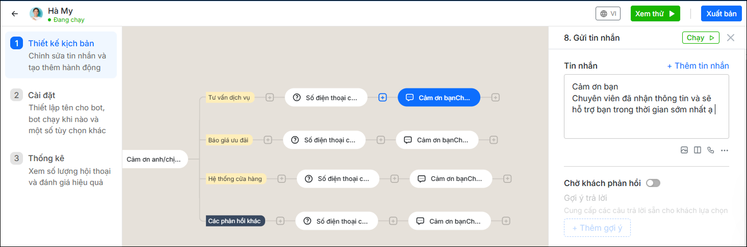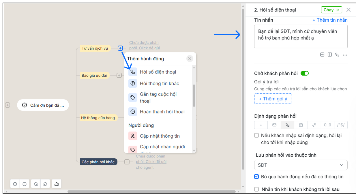 - Click chuột vào hành động đầu tiên, nhập tin nhắn hỏi nhu cầu của khách.
