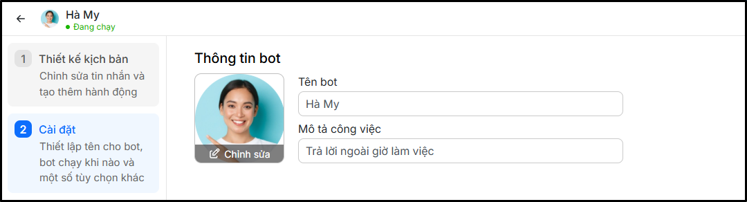 - Vào trang cài đặt Bot, hoặc click mở trang ‘Nhân viên AI’