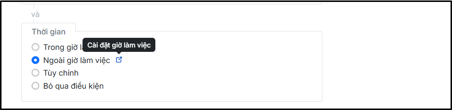 - Kéo xuống dưới mục Thời gian, bạn chọn điều kiện chạy vào ‘ngoài giờ làm việc’, ấn nút