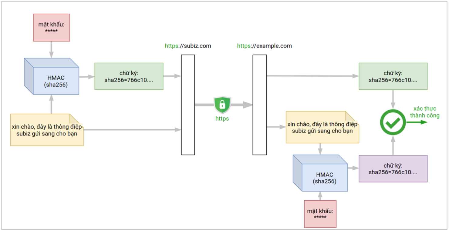 Chữ ký được tạo ra bằng thuật toán HMAC với hàm hash SHA256 (hash-based message authentication code - là một kỹ thuật cơ bản và hiệu quả, hiện đang được sử dụng rộng rãi trên hầu hết các nền tảng webhook như của facebook, google, stripe hay github). HMAC đươc triển khai sẵn trên hầu hết các nền tảng lập trình. Về cơ bản, HMAC là một hàm nhận vào 3 tham số: thuật toán hash, mật khẩu và nội dung gói tin, trả ra chữ ký cho gói tin truyền vào.