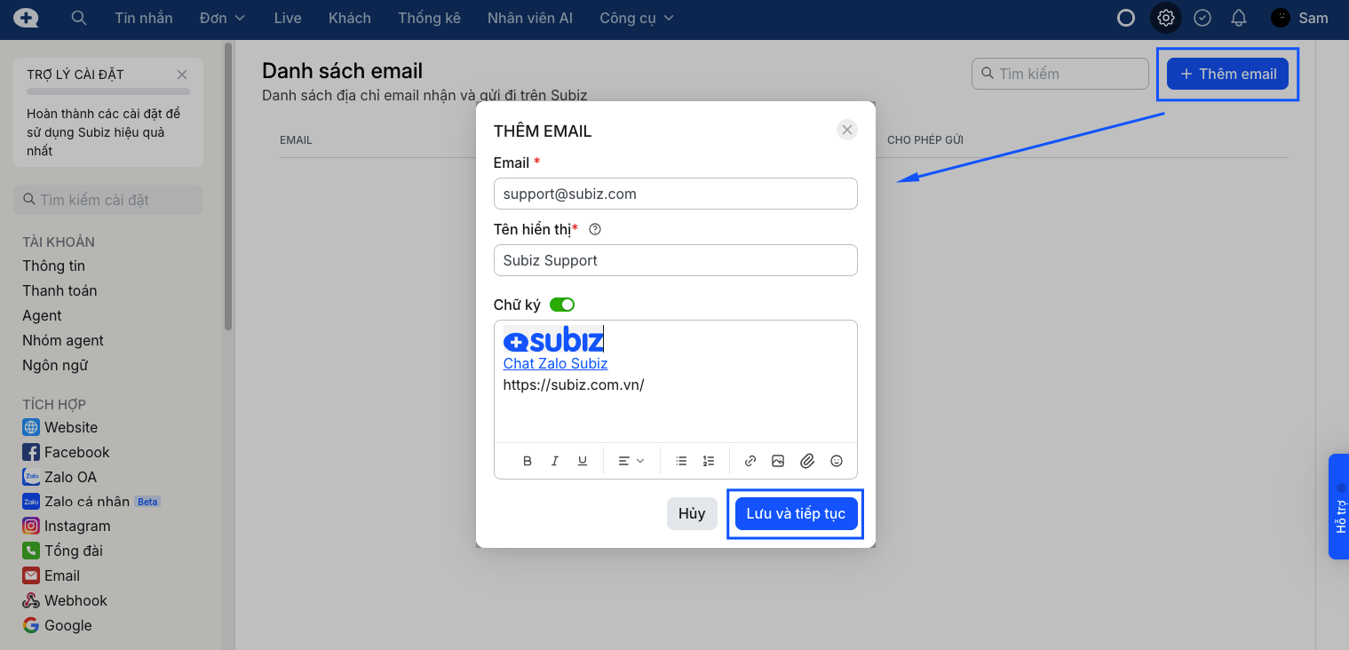 Nếu tích hợp thành công, thanh trượt sẽ chuyển màu xanh. Lúc này bạn có thể trả lời, phản hồi email ngay trên trang hội thoại Subiz.