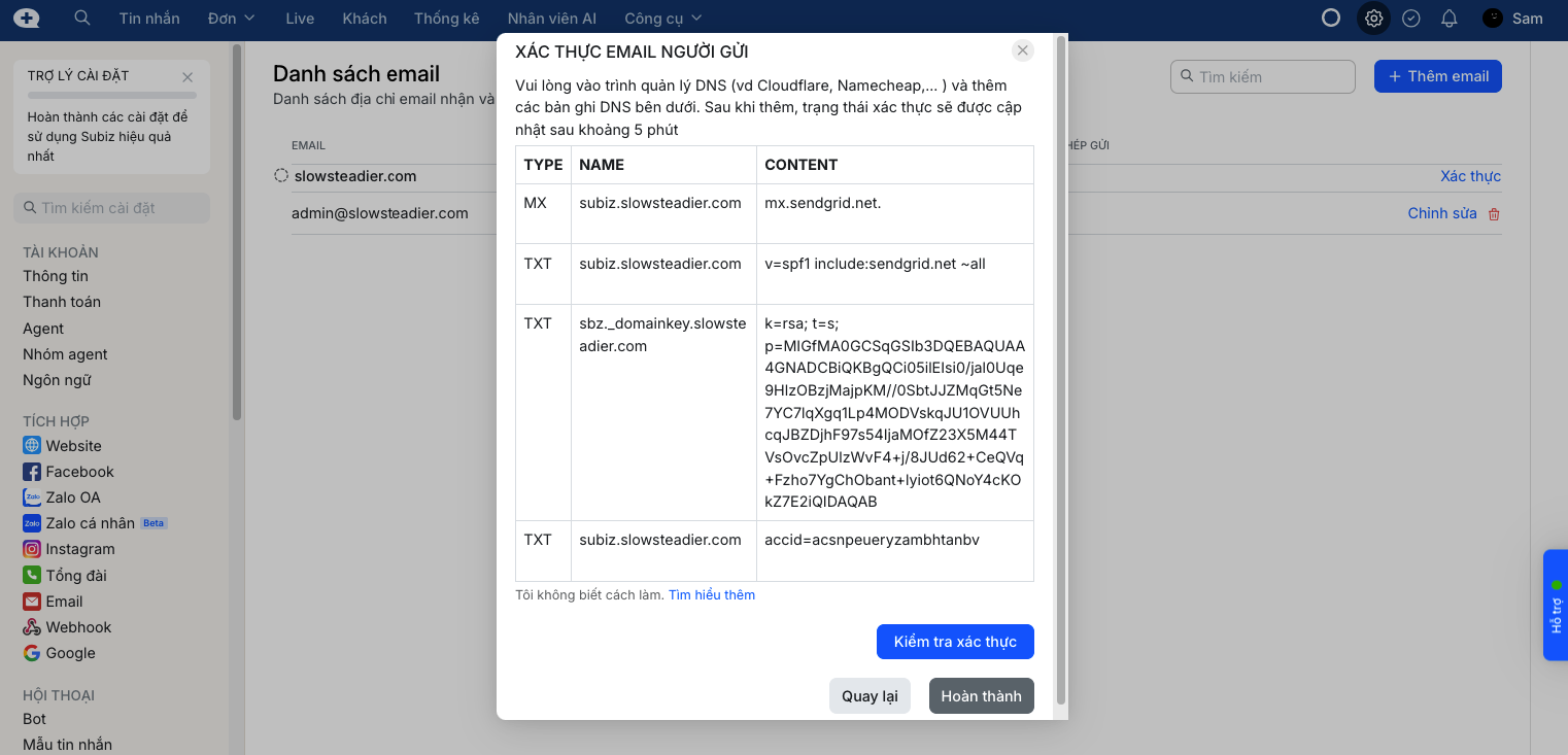 Sau khi cài đặt xong, bạn sẽ nhận được một email xác thực gửi qua Tin nhắn Subiz.