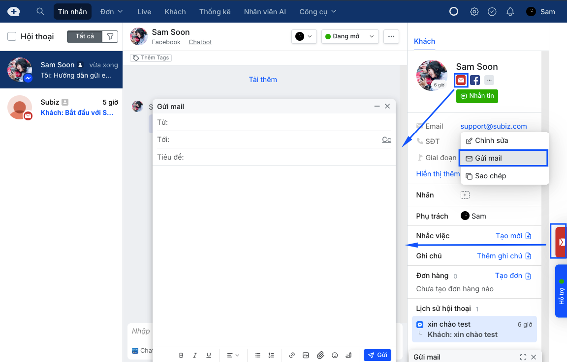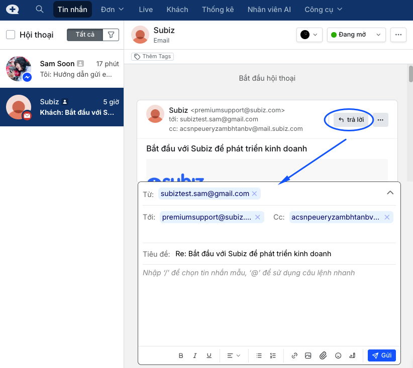 - Nhận và gửi email cho khách hàng ngay trên màn hình Subiz