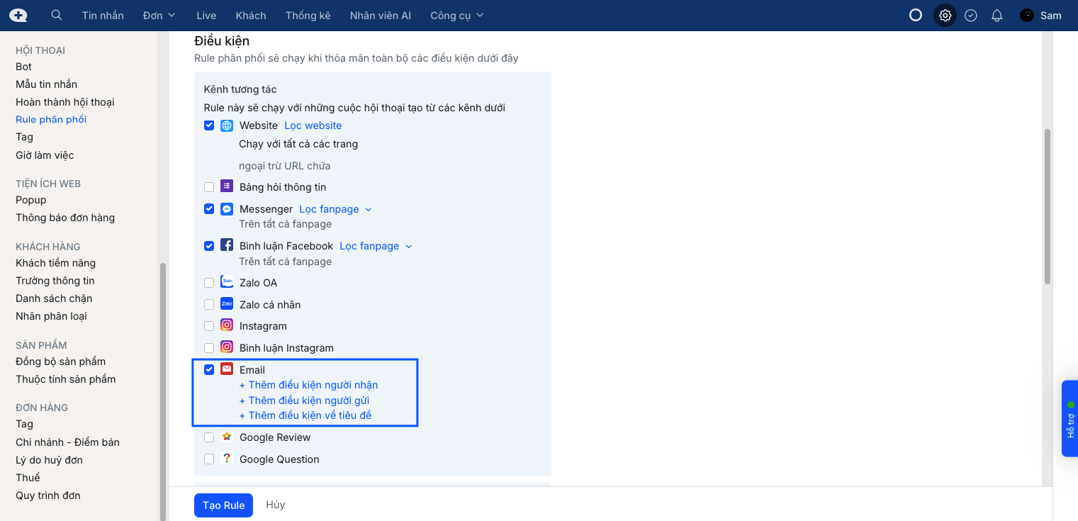 - Hoặc chỉnh sửa Rule hiện có thêm kênh Email