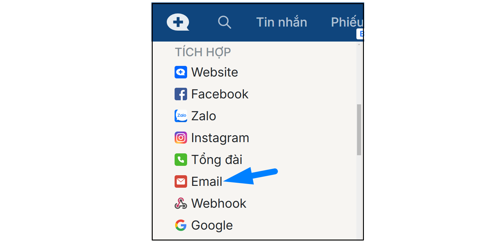 • Chọn Email tại mục TÍCH HỢP ở cột tính năng
