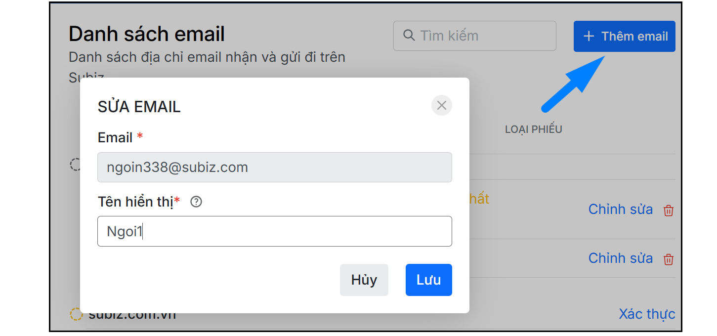 Di chuột lên góc trên bên phải chọn Thêm Email. Tiếp đó nhập địa chỉ Email bạn muốn thêm và điền tên hiển thị mong muốn. Nhấp Lưu và tiếp tục để hoàn thành như ví dụ trong hình ảnh dưới đây: