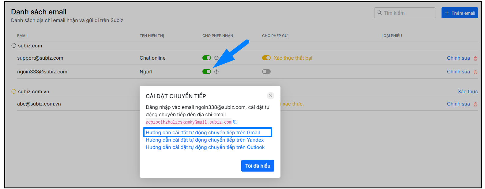 • Bật ON cột “CHO PHÉP NHẬN” chuyển sang màu xanh. Ví dụ: Email ngoin338@subiz.com.