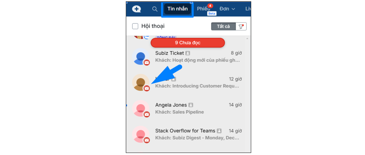 Email mới sẽ hiển thị trong trang 'Tin nhắn' với biểu tượng đặc trưng. Bạn sẽ nhận thông báo khi có khách gửi email. Nhấp vào hội thoại Email để xem nội dung chi tiết.