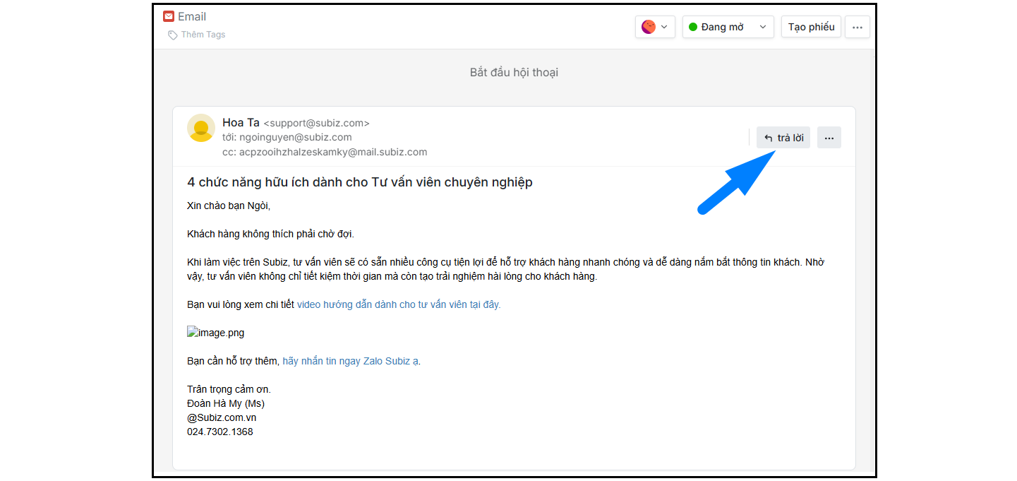 • Tính năng cho phép trả lời thư chỉ áp dụng với những Email Domain (ví dụ: ngoin338@subiz.com). Không áp dụng với các Email thông thường (ví dụ: ngoin338@gmail.com)