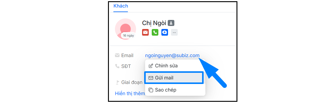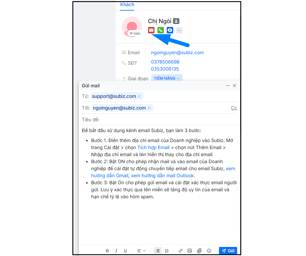 Cách 2: Nhấp chuột vào biểu tượng Email ở phần thông tin khách hàng. Tiếp đó, soạn và gửi Email như bình thường.