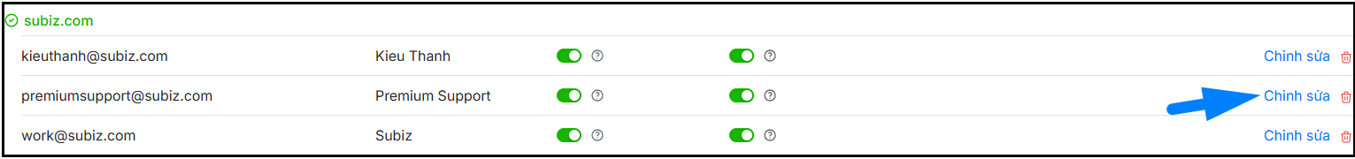 • Subiz hiển thị danh sách Email. Bạn di chuột tới Email muốn tạo chữ ký khi gửi đi cho khách hàng nhấp vào Chỉnh sửa. (Ví dụ: premiumsupport@subiz.com)