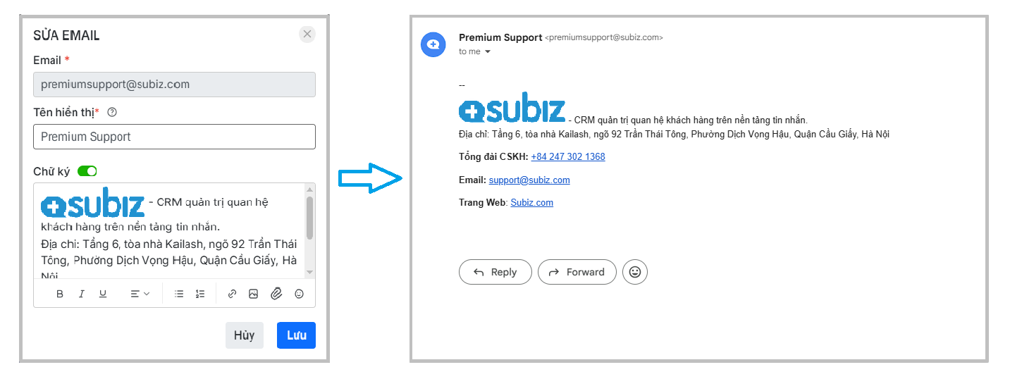 Nếu bạn đã tích hợp Email thành công trên Subiz, bạn có thể thêm chữ ký tự động vào cuối mỗi Email gửi đi, kèm theo hình ảnh thương hiệu để tăng tính chuyên nghiệp, quảng bá doanh nghiệp và xây dựng uy tín.