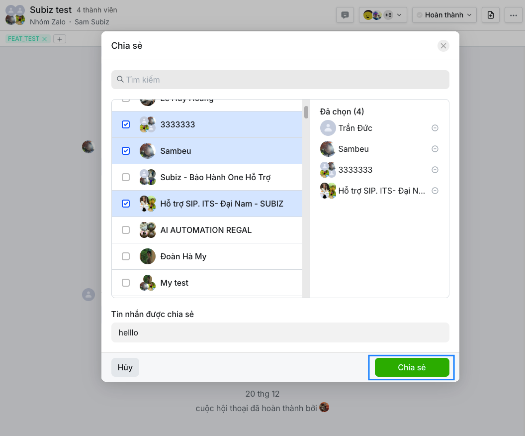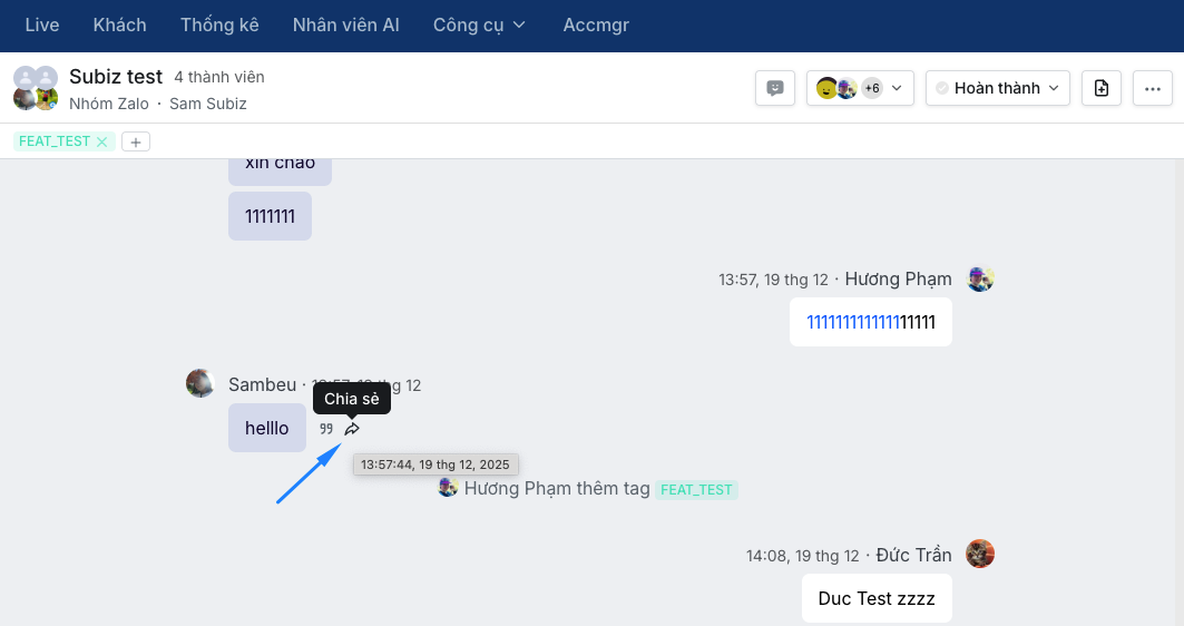 Zalo cá nhân trên Subiz tích hợp nút Chia sẻ, hỗ trợ doanh nghiệp chia sẻ nội dung tin nhắn tới hàng hoạt khách hàng cùng lúc.