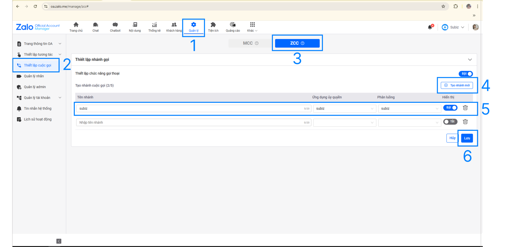 Bước 3: Thiết lập trên tài khoản Zalo OA, phân luồng cuộc gọi về Subiz