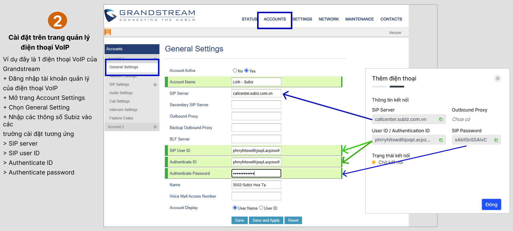 - Với VNPT sẽ cấu hình về IP Subiz 14.225.168.165:5060