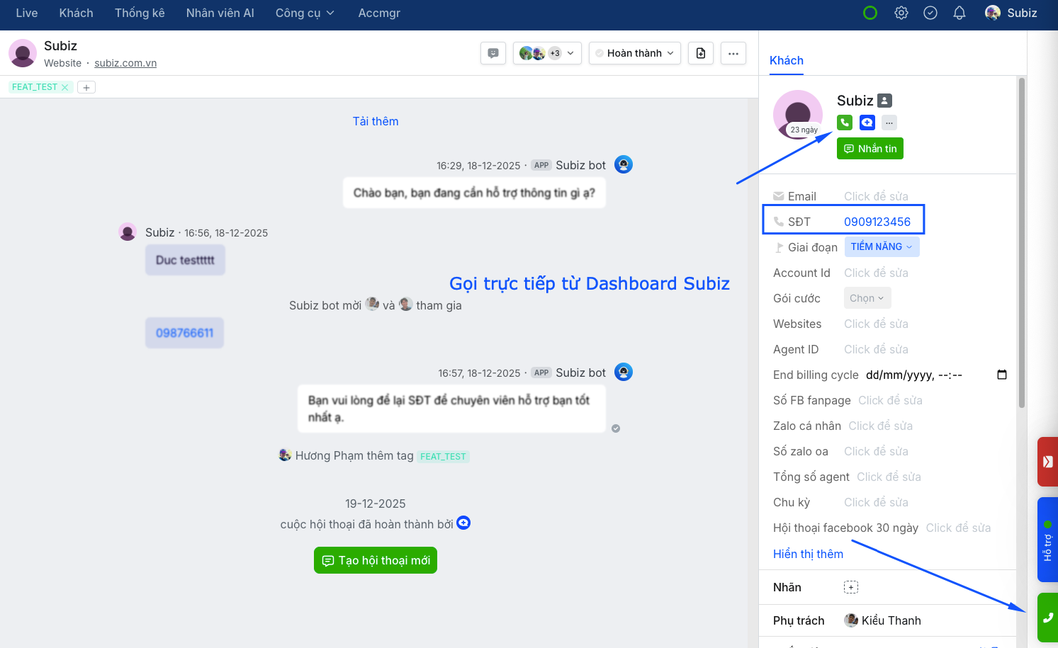 Các cuộc gọi tới số máy nhánh nội bộ trên Subiz là hoàn toàn miễn phí.