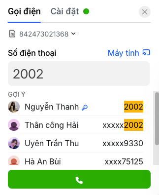 Sau khi tích hợp tổng đài thành công, trên màn hình dashboard làm việc sẽ xuất hiện icon điện thoại màu xanh lá cây ở góc dưới bên phải, ở cột hồ sơ khách hàng.