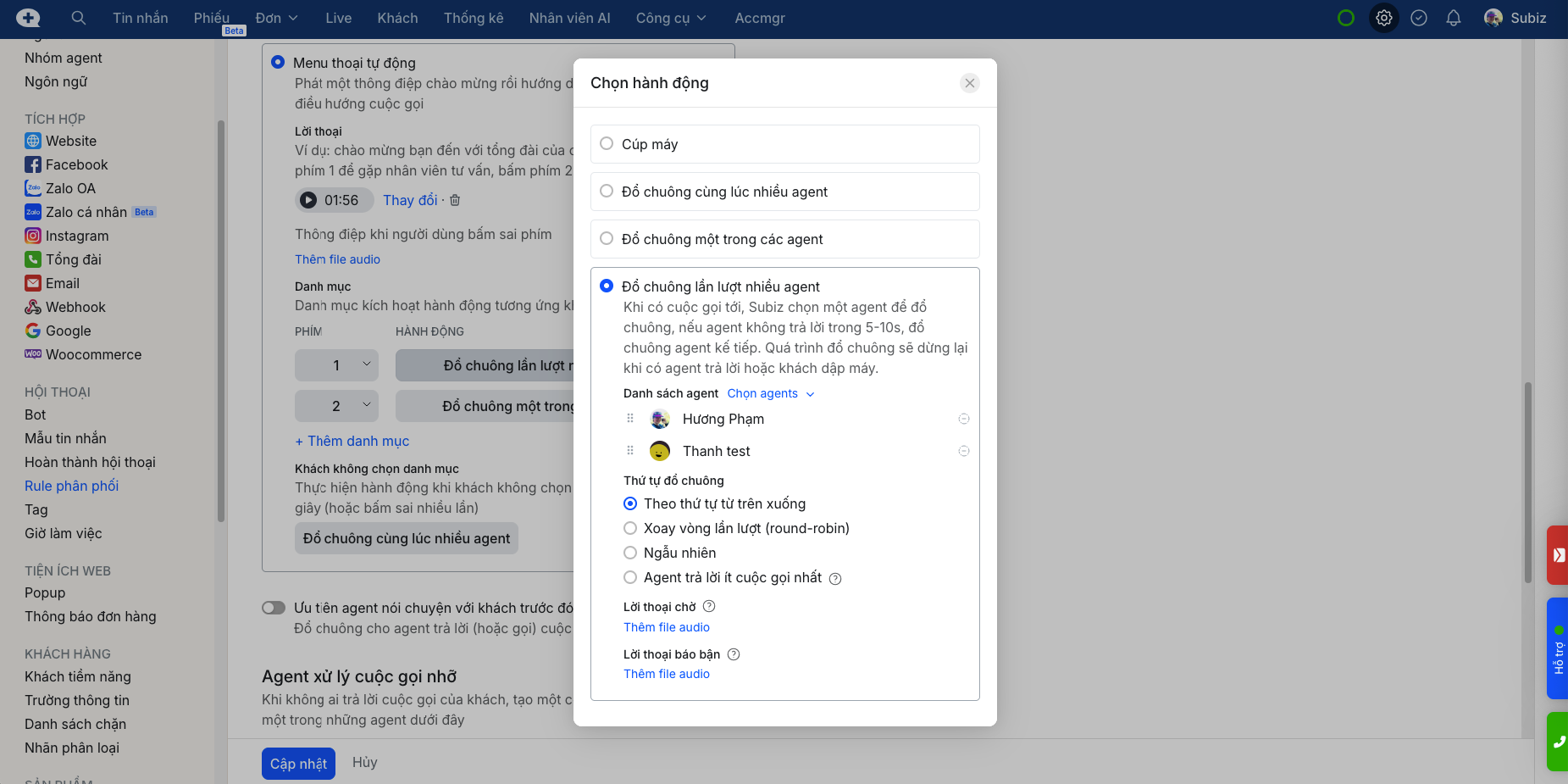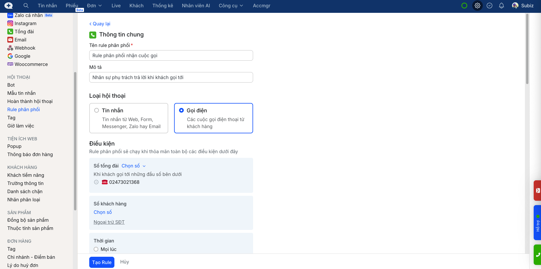 Tương tự như tất cả các kênh làm việc được tích hợp lên Subiz, quản lý sẽ cần tạo rule phân phối để lựa chọn nhân sự phụ trách: