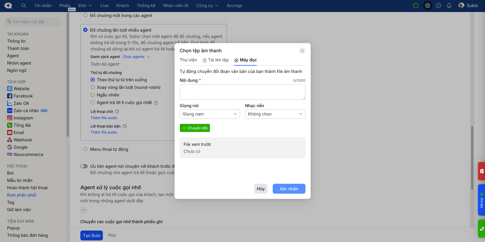 Lúc này bạn sẽ có thể lựa chọn file có sẵn hoặc tạo file mới. Subiz cho phép bạn tải tệp ghi âm có sẵn hoặc sử dụng Máy đọc tự động chuyển từ văn bản thành lời loại.