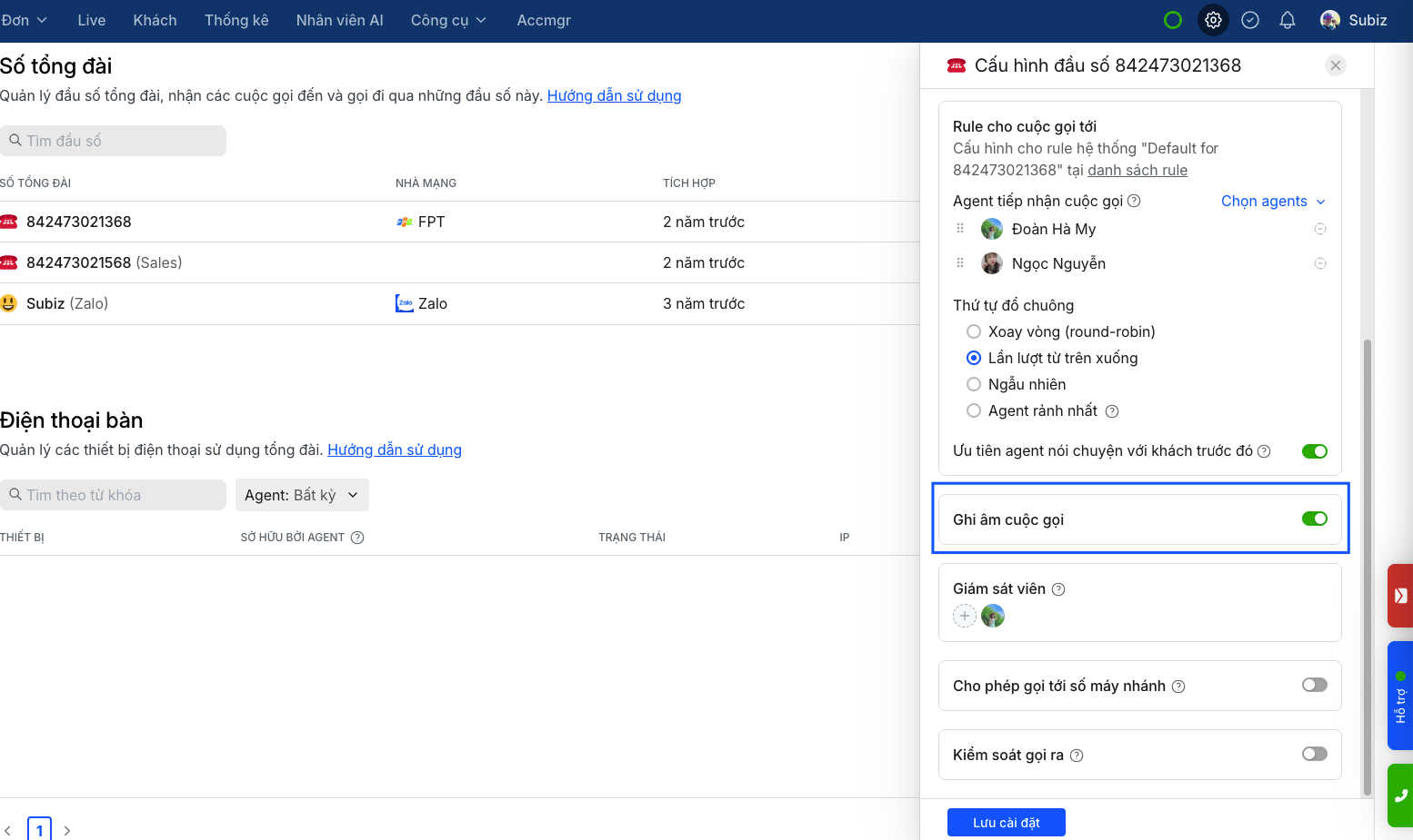 Có. Subiz hỗ trợ ghi âm cuộc gọi và lưu trữ ghi âm 12 tháng.