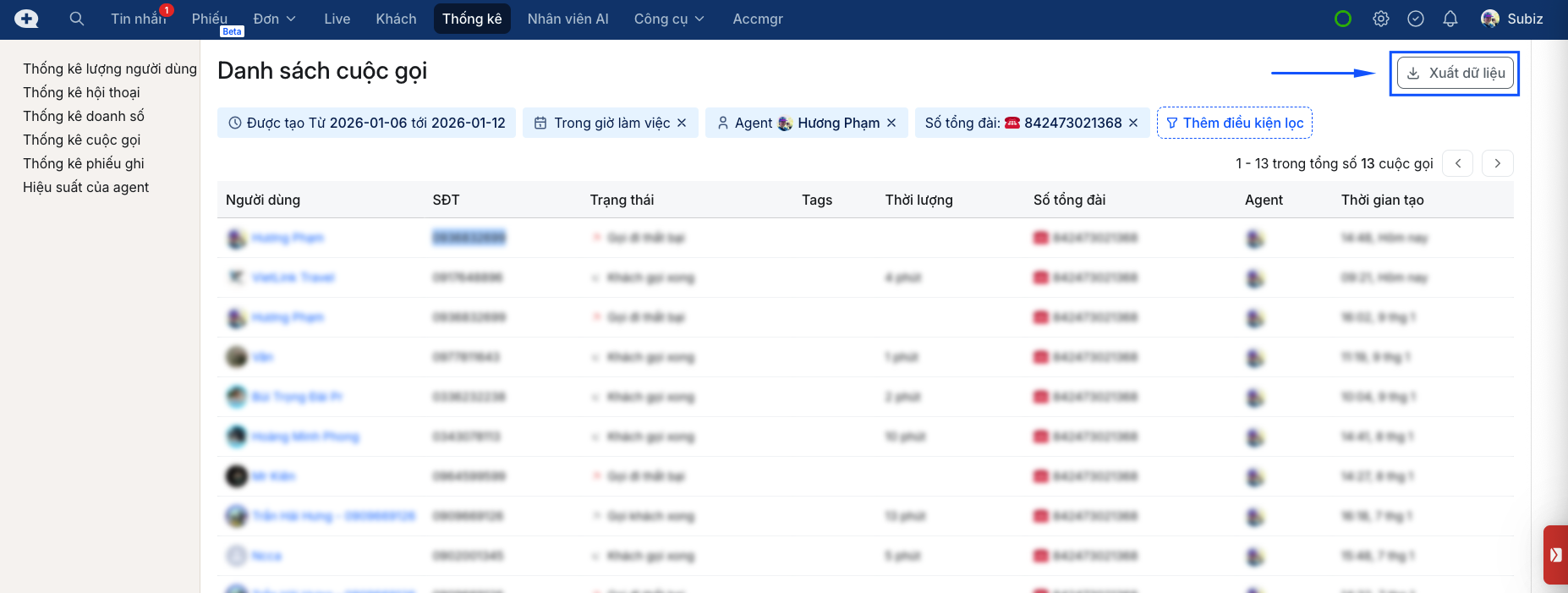 Subiz có thống kê và báo cáo cuộc gọi không?