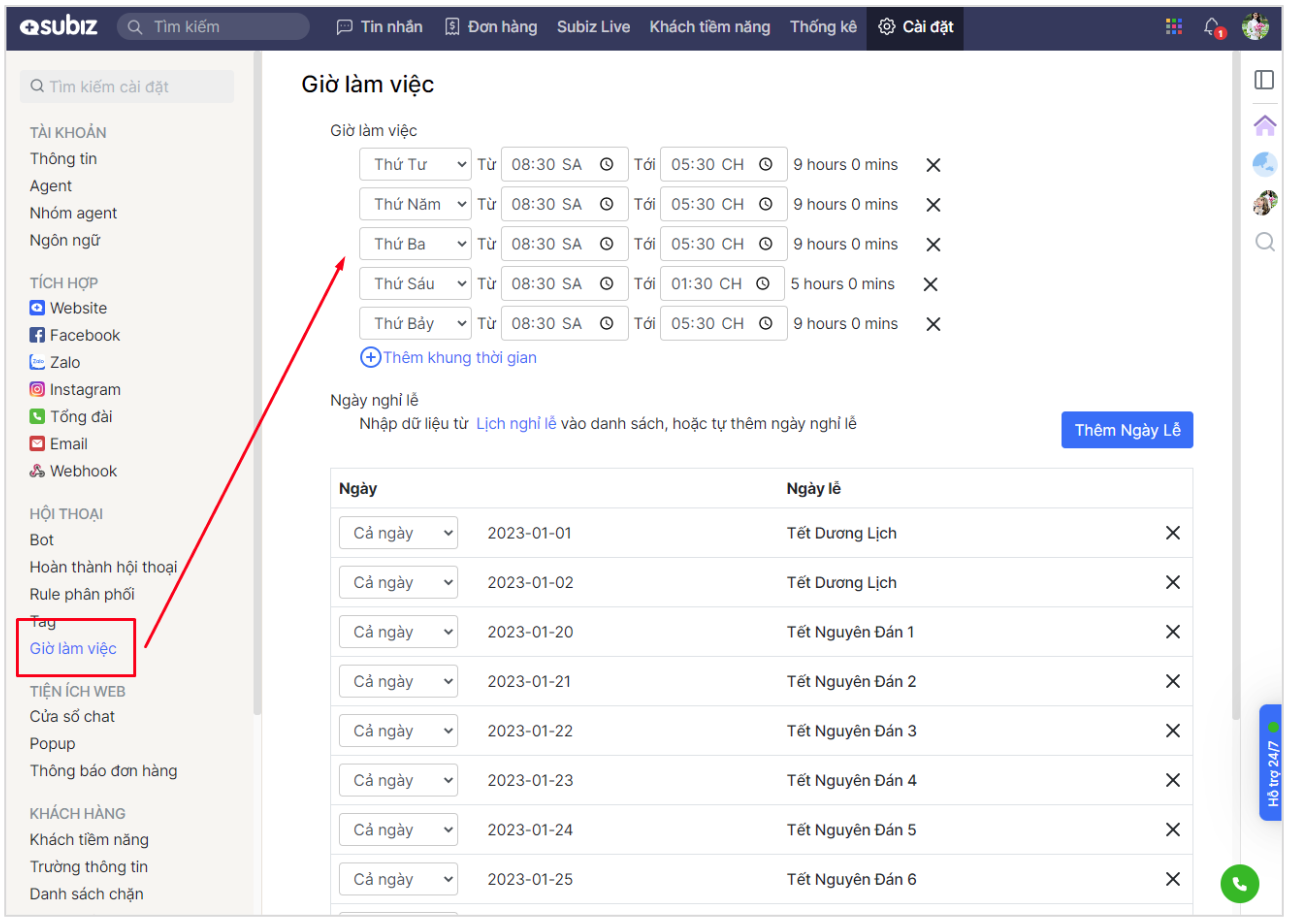 - Thêm khung thời gian làm việc trong ngày và Thêm ngày nghỉ lễ trong năm