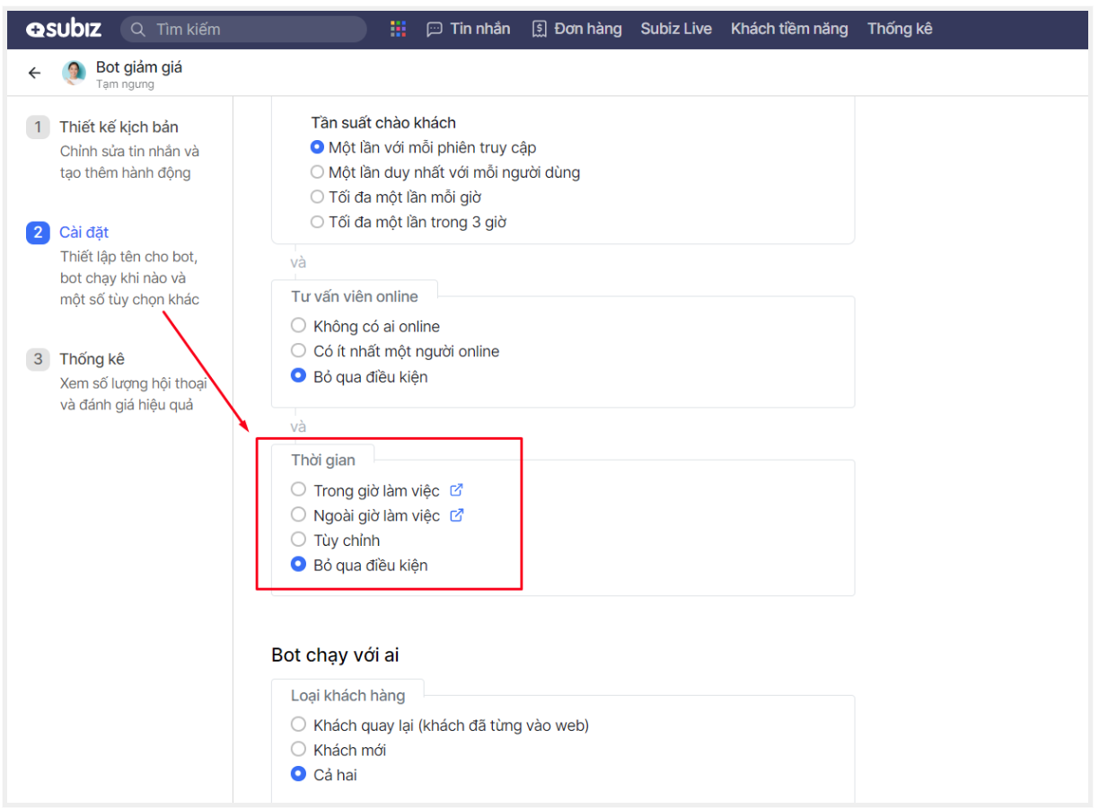 Bot tự động theo Giờ làm việcCài đặt bot tự động chào đón và trả lời tin nhắn khách hàng tại trang BOT: https://app.subiz.com.vn/bots