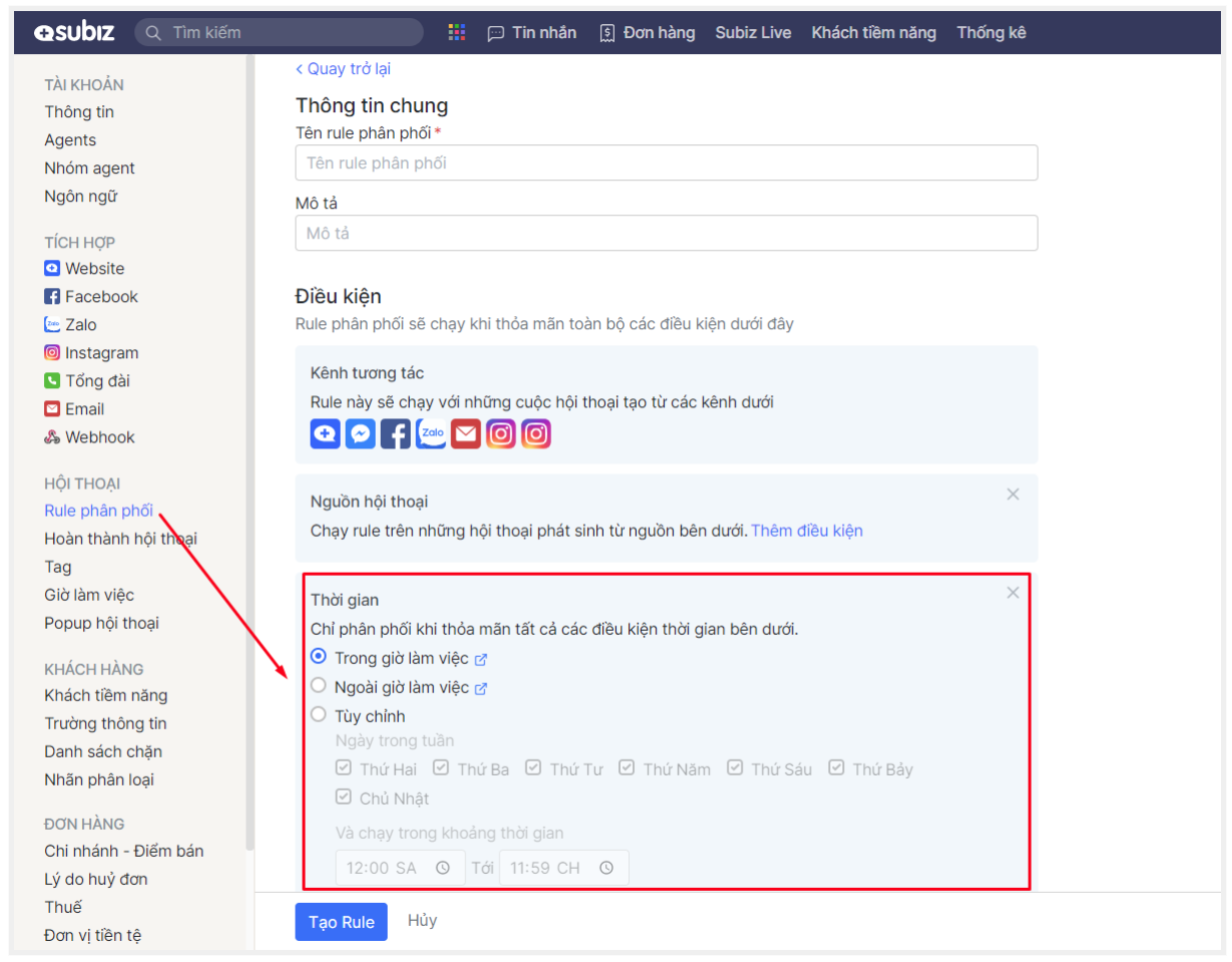 Cài đặt Rule phân phối hội thoại của khách cho các agent trực chat tại trang Rule phân phối: https://app.subiz.com.vn/settings/rule-setting