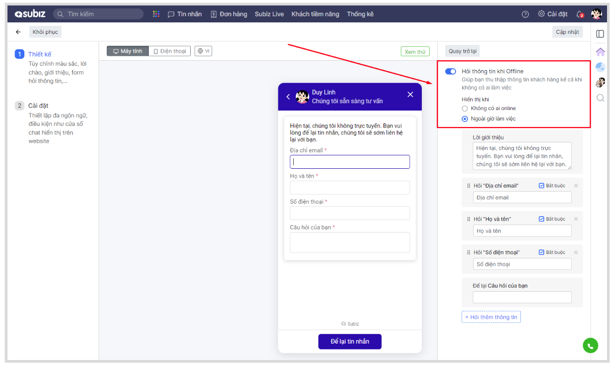 Cài đặt bảng hỏi thông tin trước khi chat tại trang Chỉnh sửa cửa sổ chat: https://app.subiz.com.vn/chatbox/design
