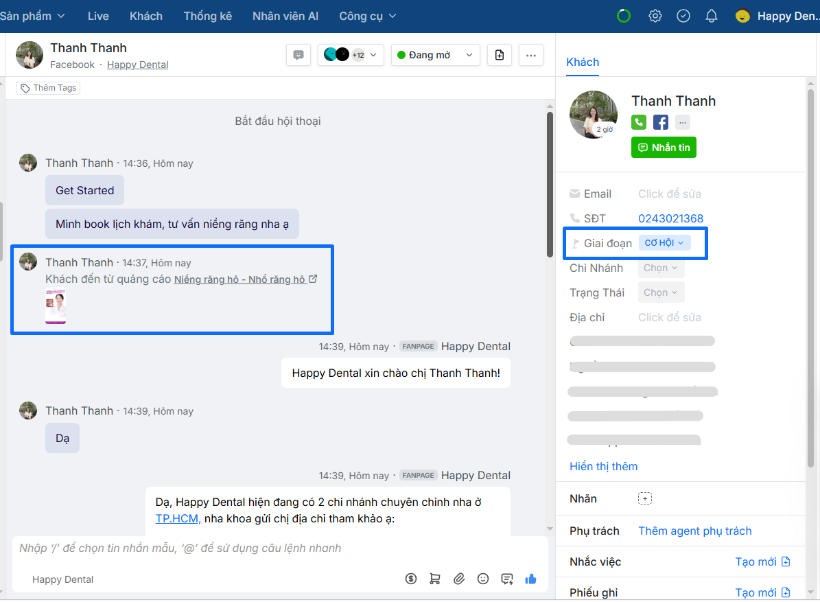 - Trên màn hình hội thoại với 1 khách từ quảng cáo