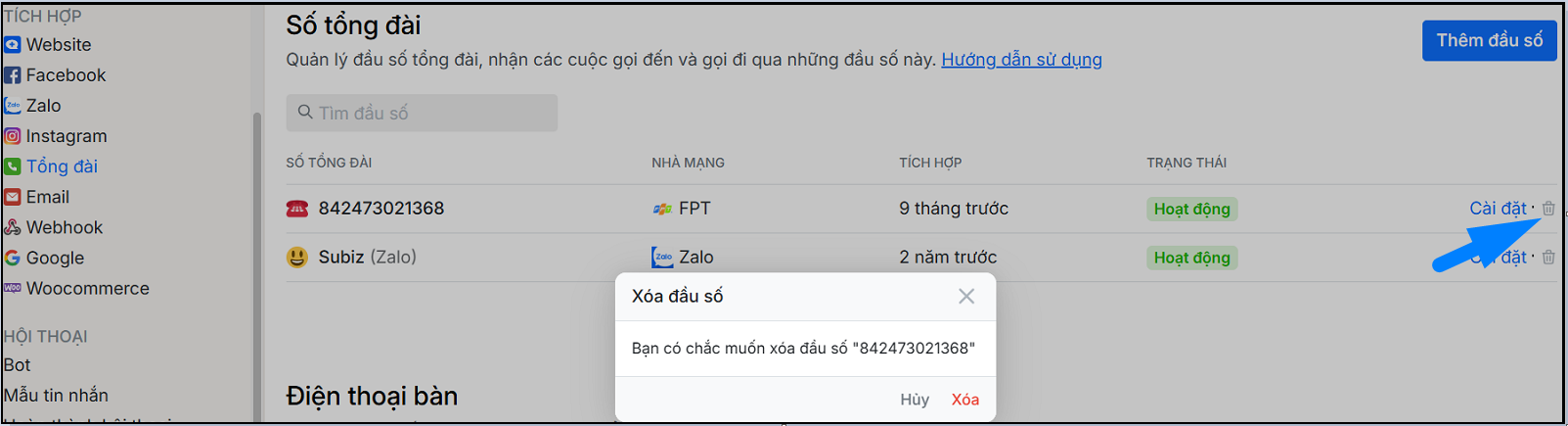 • Tìm số tổng đài cần xóa, nhấp vào biểu tượng thùng rác => Chọn Xóa để hoàn tất.