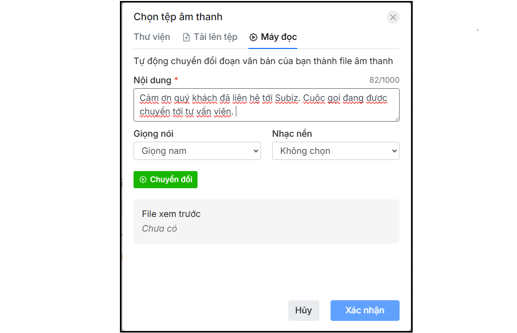 • Nếu chưa có file: Chọn Máy đọc, nhập nội dung, chọn giọng đọc và nhạc nền, rồi Xác nhận.