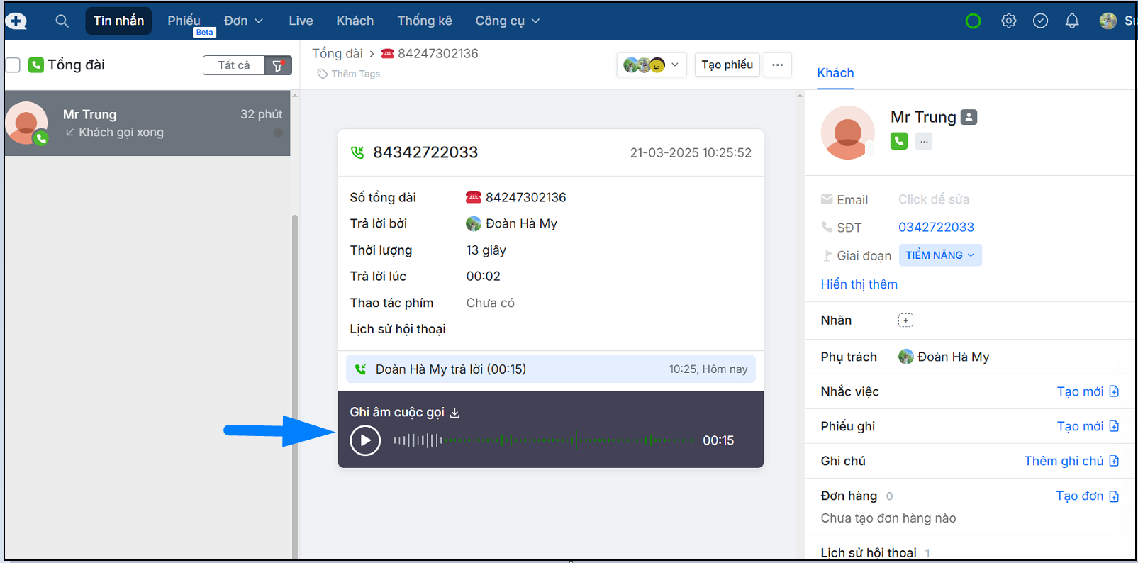 • Tìm cuộc gọi theo số điện thoại hoặc hội thoại khách hàng (VD: khách hàng tên Mr.Trung)