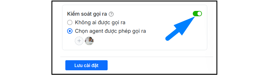 • Di chuột xuống mục Kiểm soát gọi ra trong cấu hình Tổng đài và bật ON kiểm soát gọi ra. Tại đây bạn có thể tích chọn:
