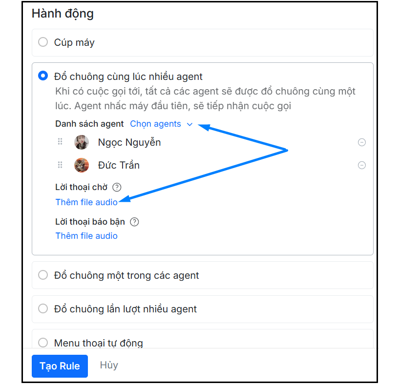 • Chọn hành động: Khi khách gọi đến, bạn muốn những nhân viên nào nhận được cuộc gọi, muốn cách đổ chuông cho các nhân viên như nào? khách nghe lời thoại chờ gì trong lúc chờ nối máy,... hãy thiết lập chi tiết tại đây.