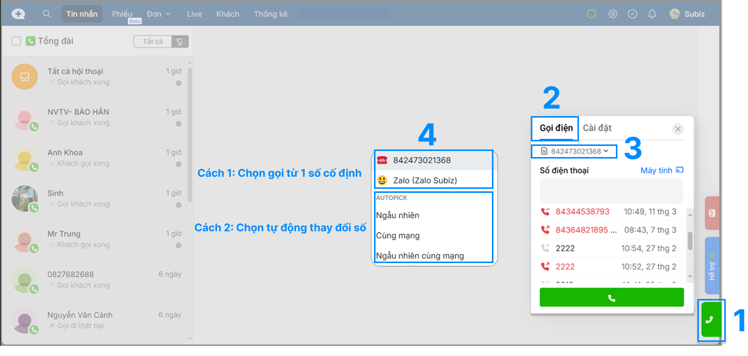 • Cùng mạng: Subiz chọn số gọi ra cùng nhà mạng với số của khách hàng.