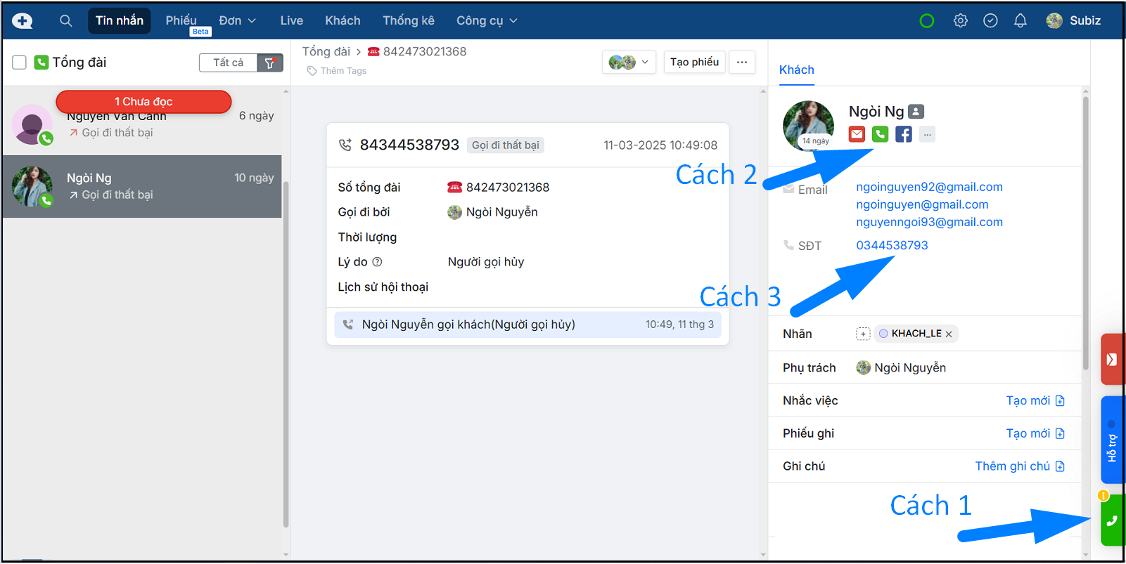 Cách 2: Nếu khách hàng đã lưu SĐT trên Subiz thì agent nhấp nút GỌI ở phần thông tin khách hàng.