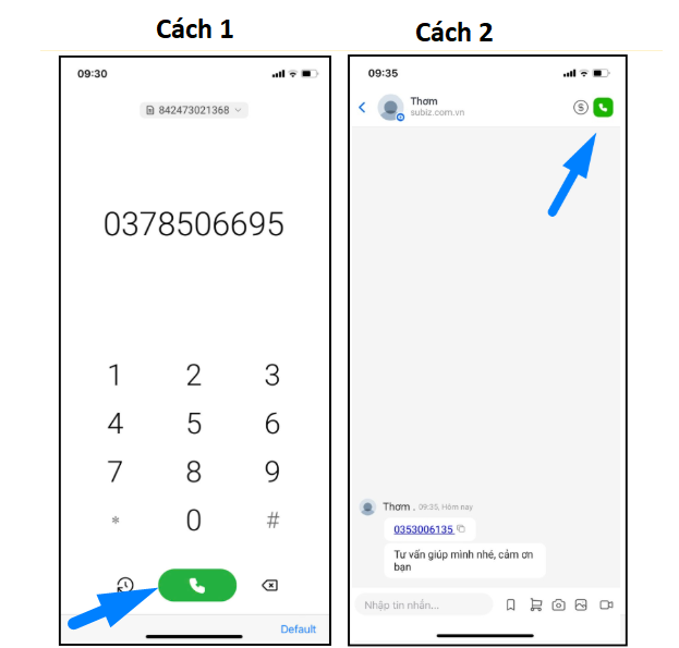• Cách 2: Nếu số điện thoại khách đã được lưu trên Subiz, agent có thể nhấn GỌI ngay trong phần thông tin khách hàng trên ứng dụng.