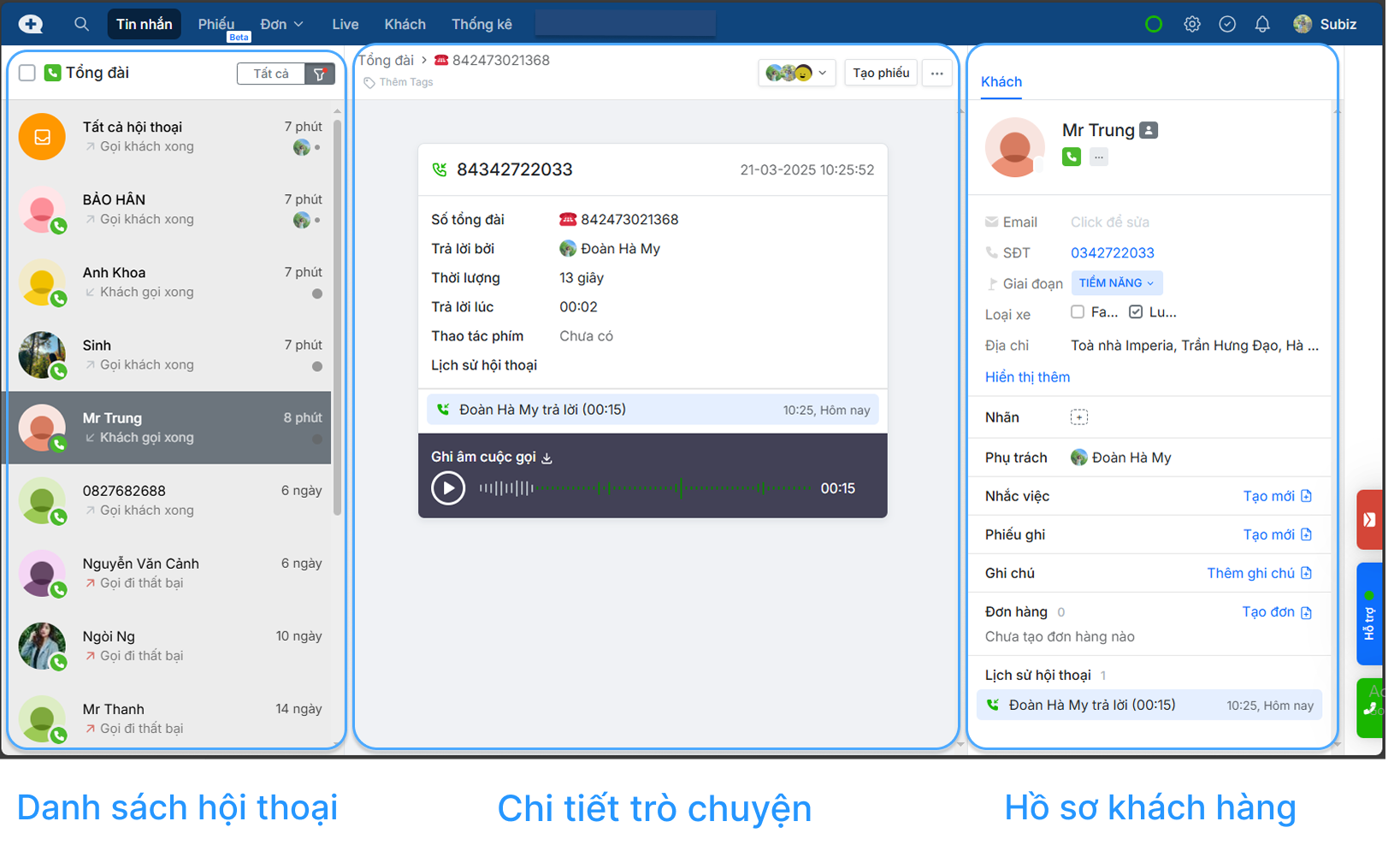 Bạn có thể dễ dàng kiểm tra người gọi đến và số tổng đài nhận cuộc gọi trực tiếp trên Trang Tin nhắn Subiz. Càng hiểu về khách hàng bạn sẽ càng chủ động hỗ trợ khách hàng nhanh chóng và chuyên nghiệp hơn.