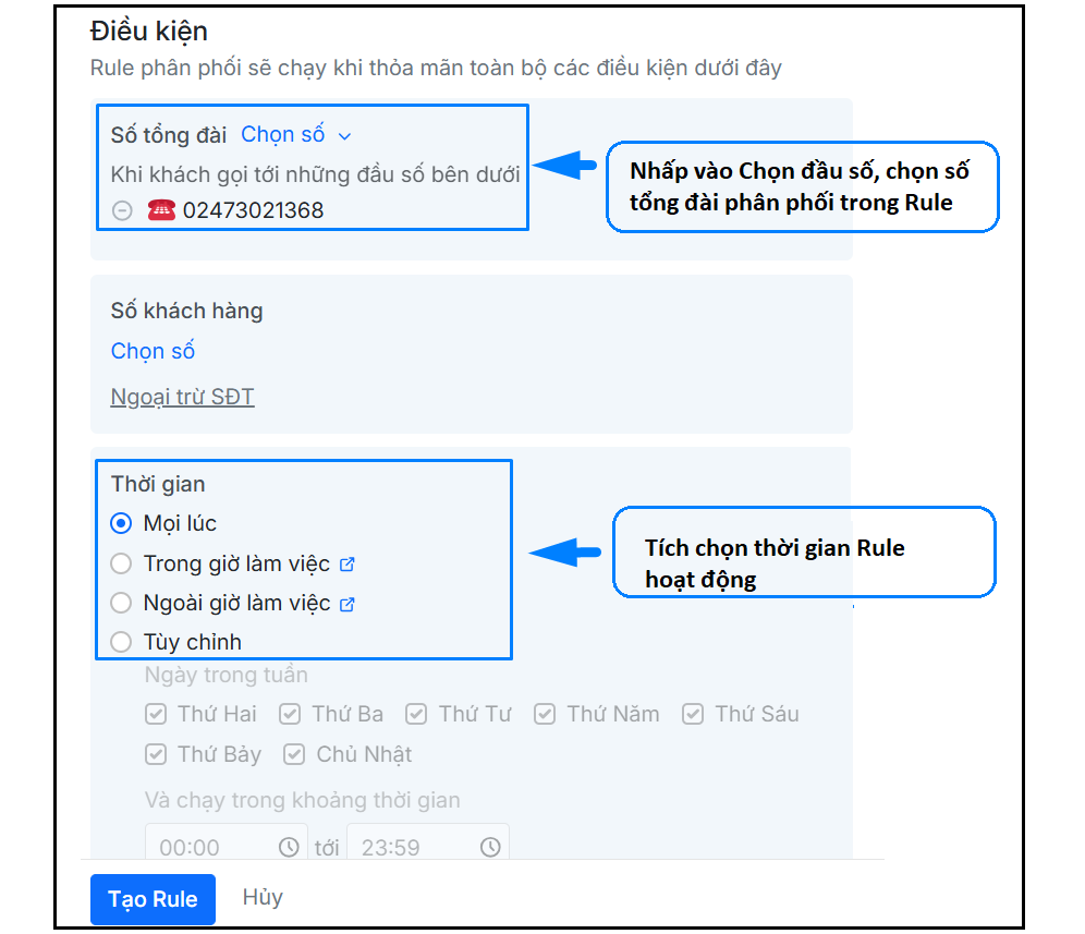 Bạn muốn Rule này áp dụng cho đầu số tổng đài nào, thời gian hoạt động khi nào. Hãy thiết lập các điều kiện tại đây: