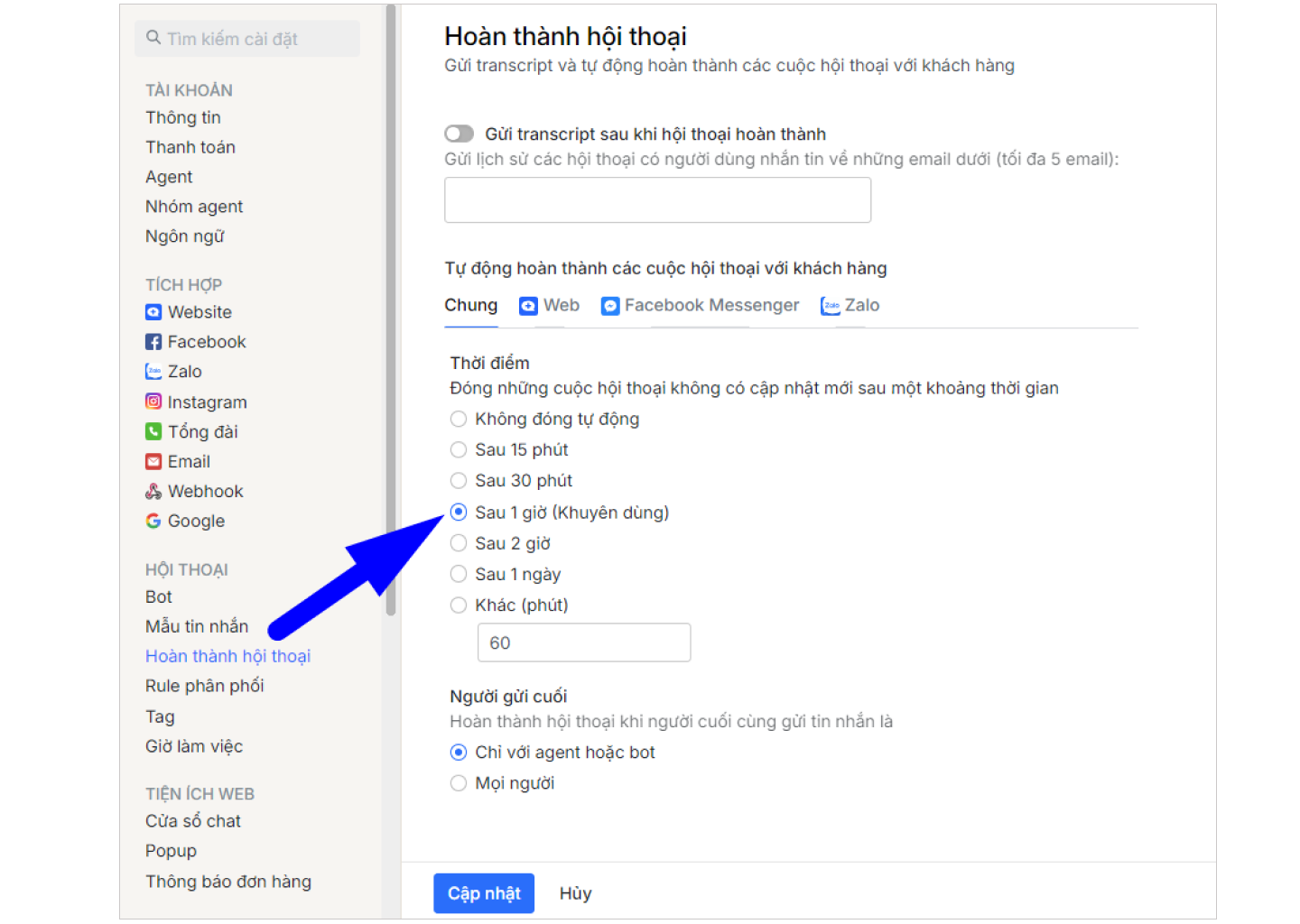 Lưu ý: Chỉ những hội thoại được tạo sau thời điểm cài đặt chức năng tự động hoàn thành mới áp dụng tính năng này.