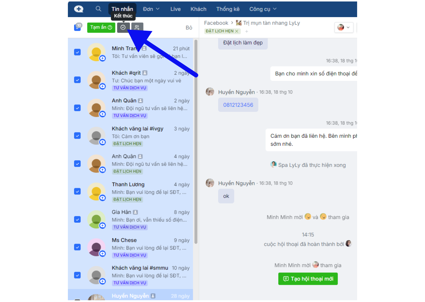 Cách 2: Tích chọn nút Hội thoại trên đầu danh sách hội thoại, rồi chọn tiếp các hội thoại cần hoàn thành và bấm nút Kết thúc
